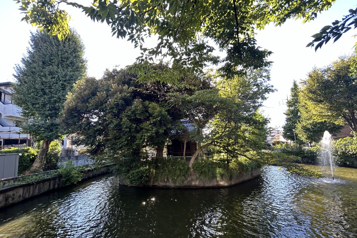 龍子記念館入口の表示板の出ていた臼田坂下から、後者のルートをなぞっていこう。左側は南馬込3丁目、右側は中央一丁目の境界線のこの道、左方の崖上に川瀬巴水が『馬込の月』で描いたような、いい形の松が1本見える。おもえば巴水が住んでいたのは、ちょうどこの方向の奥。平張と呼ばれた地域である。そのうち行きあたる環七は、文士村盛況の昭和初期は谷中通りと呼ばれる狭い道で、北進した右手の奥に弁天池のある厳島神社が祀られている。ちなみに弁天池に行くには、環七をストレートに進むよりは、並走する昔の川筋から右手の木原山の方へ上がって、山王ロッヂという古めかしいアパートの傍ら、崖際の小道からアプローチした方がおもしろい。
