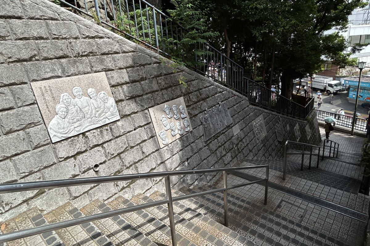 いま、その面影はない(闇坂の脇の石垣くらいか……)けれど、八景園に隣接する天祖神社は健在で、大森駅前の池上通りの商店際に石段の口がある景色は、のどかな地方の町の風情がある。そう、この石段の側壁に馬込文士たちの顔を彫りこんだ、なかなかインパクトのあるレリーフが設置されている。馬込・大森の散策はとりあえずここをゴールとしよう。