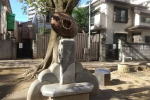 白金北里通りのだんご屋と、豆腐屋の並びの横路地の石段を上がると雷神山児童遊園というのがあって、写真のような雷神を表すモニュメントが置かれている。昭和の戦前くらいまでの地図にはここに雷神社と⛩の表示があるから、実際に祠(ほこら)などがあったのだろうが、平安時代に流行した疫病を鎮めるために雷神が祀られたのが源らしい。地形的に高台の端っこで、古地図に独立した高木のマークもあることから、雷がよく落ちる場所だったのかもしれない。