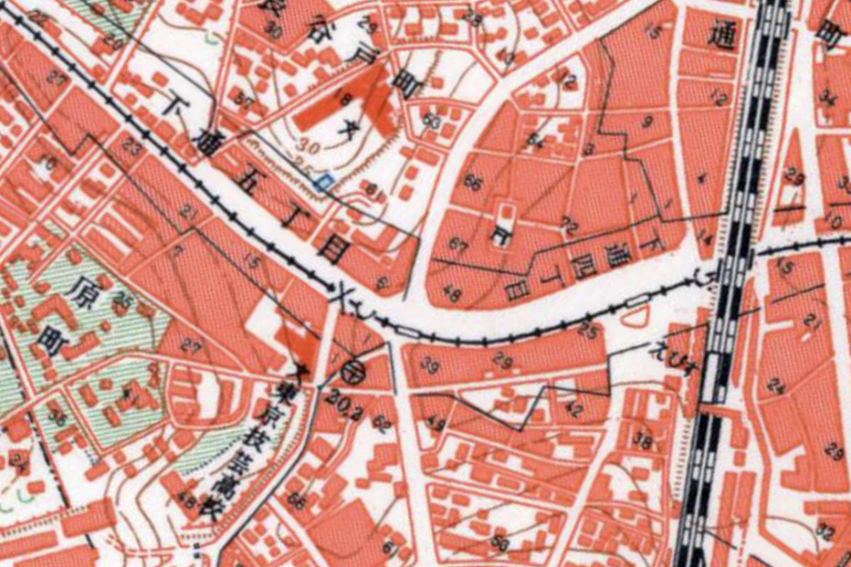 それはともかく、ここまで歩いてきたのは、古地図と照らし合わせたとき、ちょうどこのあたりに「エビス長者丸」という東京市電の停留所があったのだ。天現寺から分かれた支線の終点で、戦時中に廃止されたようだが、ビール工場の従業員が主客だったのだろう。ちなみに「長者丸」は南側の丘のお屋敷街・上大崎長者丸の地名に由来する。
