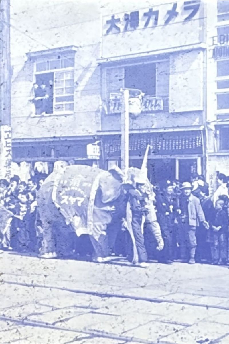昭和20年代の中頃、タイから上野動物園に寄贈された象のはな子を皮切りに、象がブームになった当時、駅前にあった「スヤマ」という小型デパートが何かのセールのときに作ってパレードに使ったハリボテ象らしい。