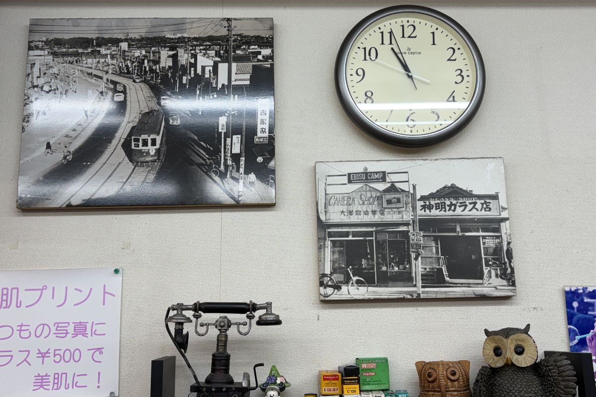 ここは店内の壁に先々代が撮影したという昭和20年代くらいの近所の写真が展示されている。駒沢通りを中目黒まで行っていた都電が走っている景色とか、防衛庁技研のところに駐留していたGHQの軍用車のショットとか……なかに、この店の前あたりを象が歩いている写真がある。