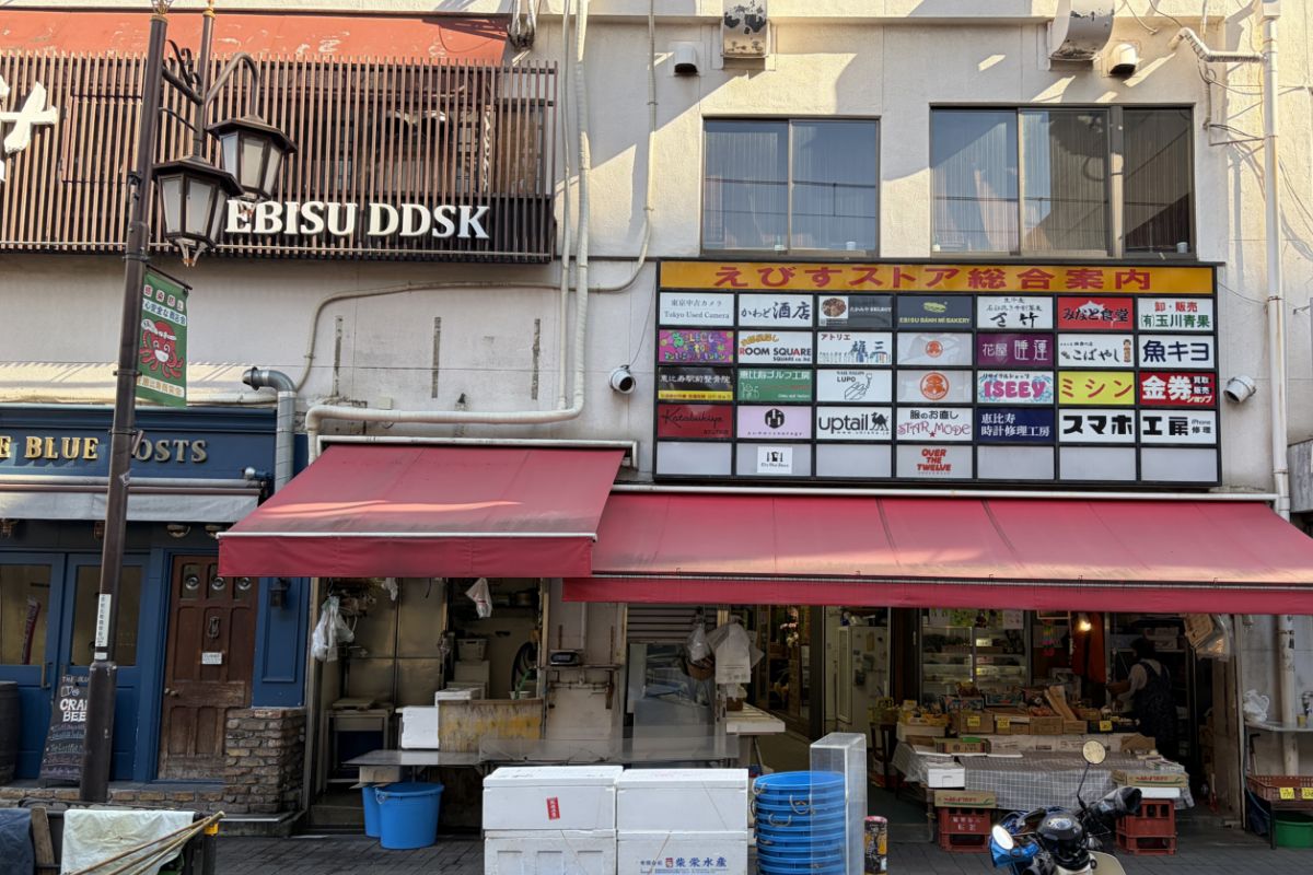 のどかな時代の恵比寿の話を伺ってから、山手線入り口脇のエビスビールの“ゑびす像”を横目にコンコースを東側へ出ると、その先のバス通りの方まで通り抜けられる「えびすストア」がある。小規模なアメ横のようなこのマーケット、おそらく始まりは戦後の駅前ヤミ市なのだろうが、最近は若い人がやるバーやアジアンフードの店なんかに移り変わってきている。店のタイプは変われど、駅前にこういうごちゃっとした感じの場所が残っているところが、恵比寿の魅力でもある(やりすごしたが、西口には純喫茶「銀座」などを残した恵比寿銀座商店街もある)