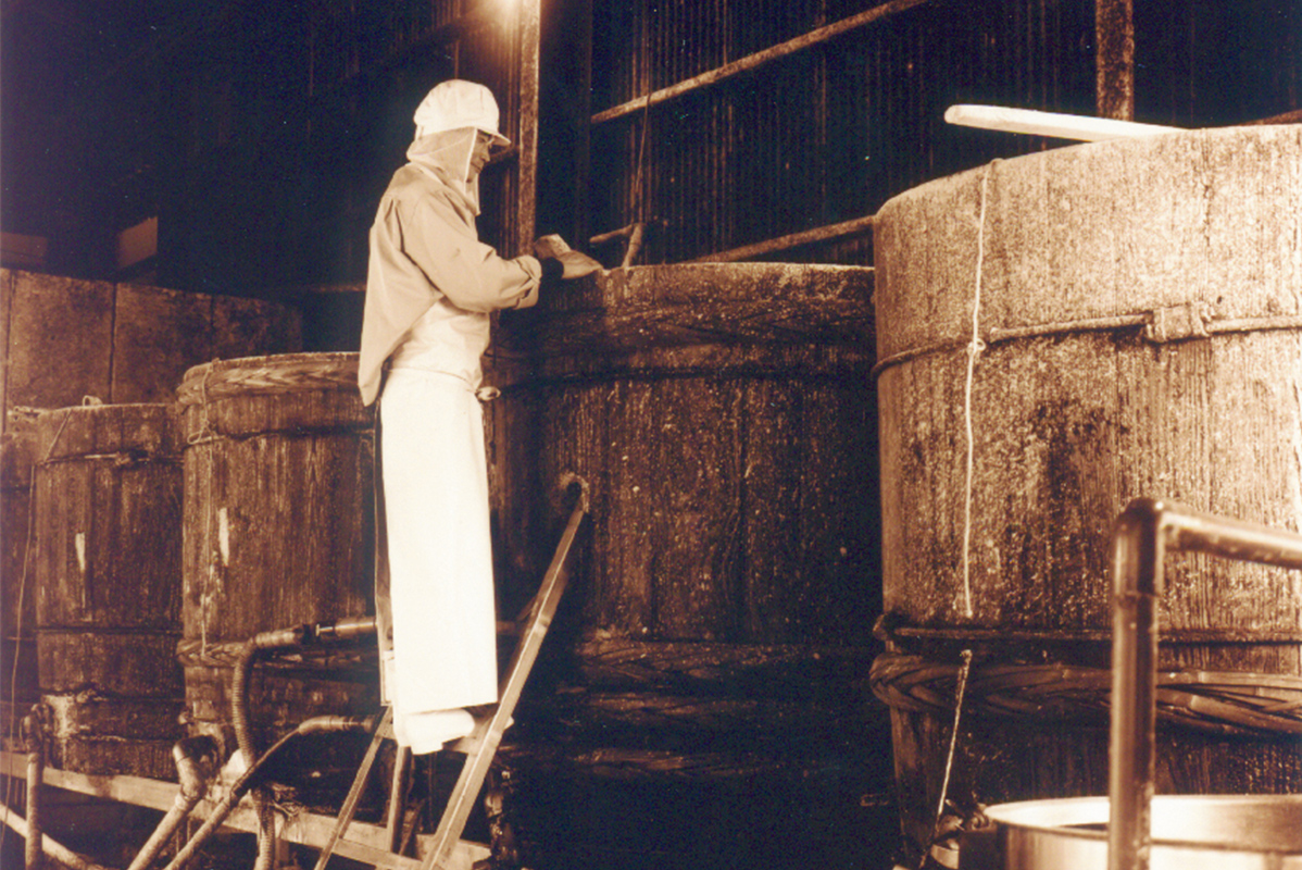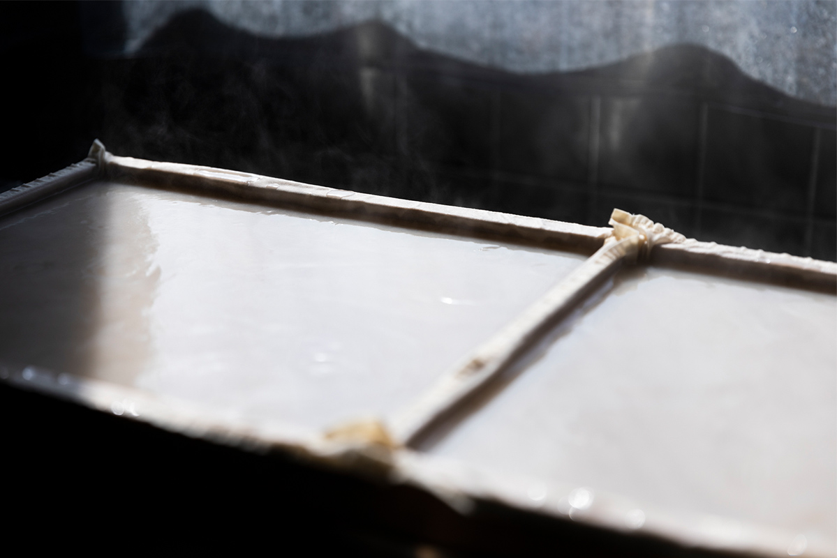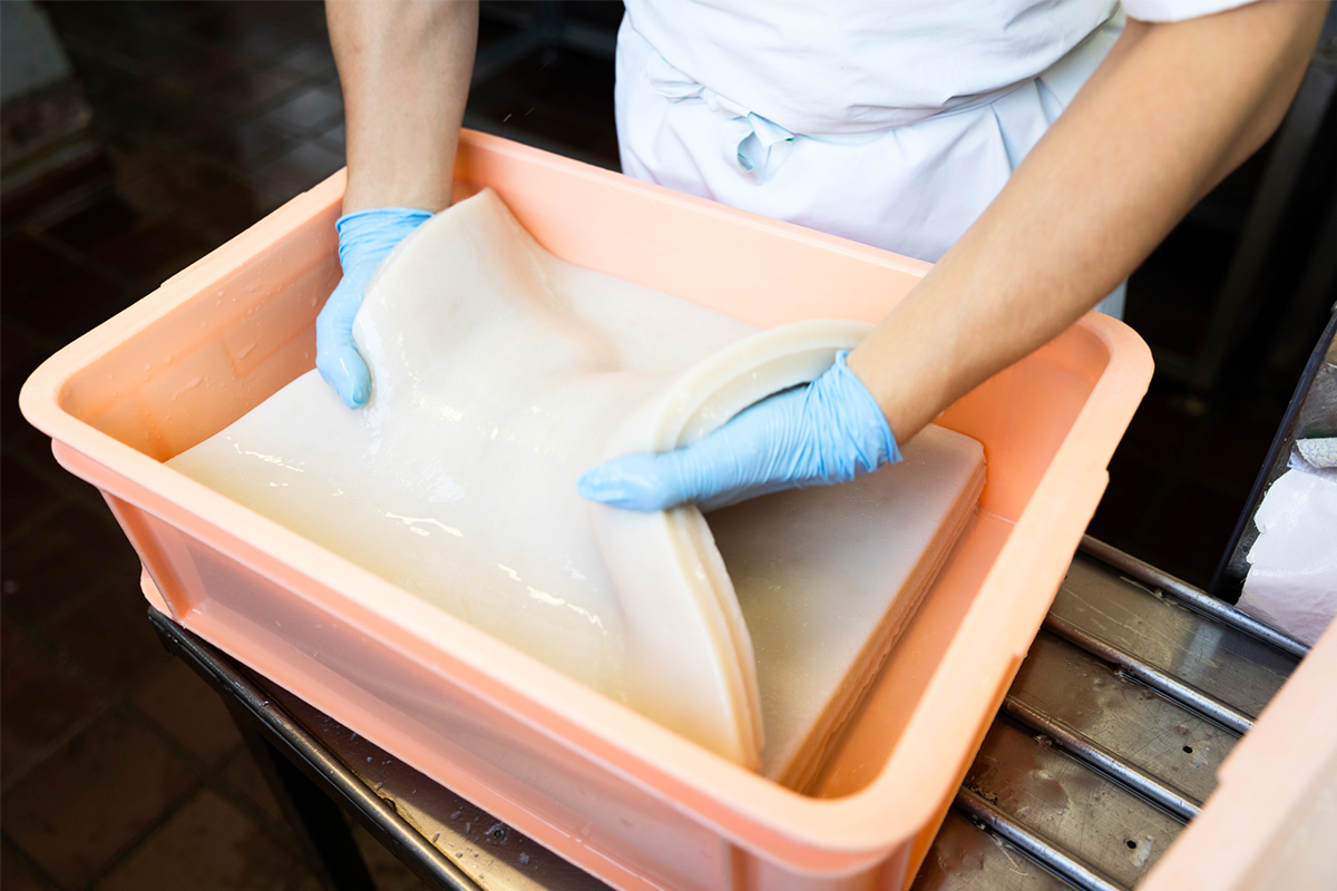 「くず餅ひと筋真っ直ぐに」を企業理念とし、200年の時を超えて愛されてきた船橋屋。くず餅の魅力は、なんといってもその絶妙な弾力だ。厳選した小麦澱粉を木樽で450日もの間、自然発酵させることで、独特のもっちりした食感を生みだす。かつては店の裏で一枚一枚せいろで蒸していたそうだが、約50年前に本店裏に工場が完成し、部分的に機械化されてからも、熟練の職人が指の腹でくず餅の弾力を確認する「あたり」という作業が欠かせない。発酵食品だからこそ、季節や環境で味も食感も変わる。機械に頼り切るのではなく、人の目で見て蒸し時間や濃度を微調整することで、船橋屋の変わらぬ味が今に継承されているのだ。