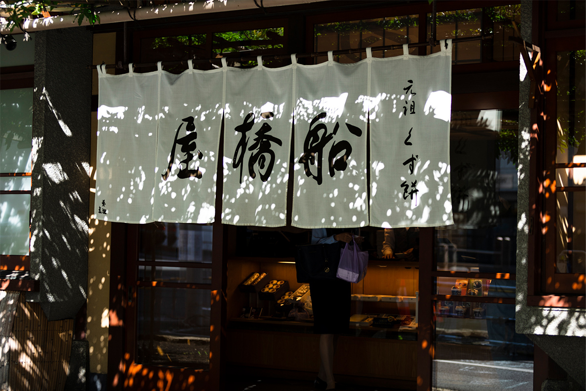 店舗の入口に掲げた暖簾の文字は、戦前から戦後にかけての国民的作家、吉川英治によって書かれたものだ。執筆に疲れると黒蜜をパンに塗って食べていた吉川が、あちこちの黒蜜を試した結果、船橋屋の黒蜜をたいそう気に入ったことで縁ができたという。また、文豪・芥川龍之介や永井荷風の著書にも船橋屋のくず餅が登場することから、その歴史の深さと同時に、当時から広く親しまれてきたことがうかがえる。
