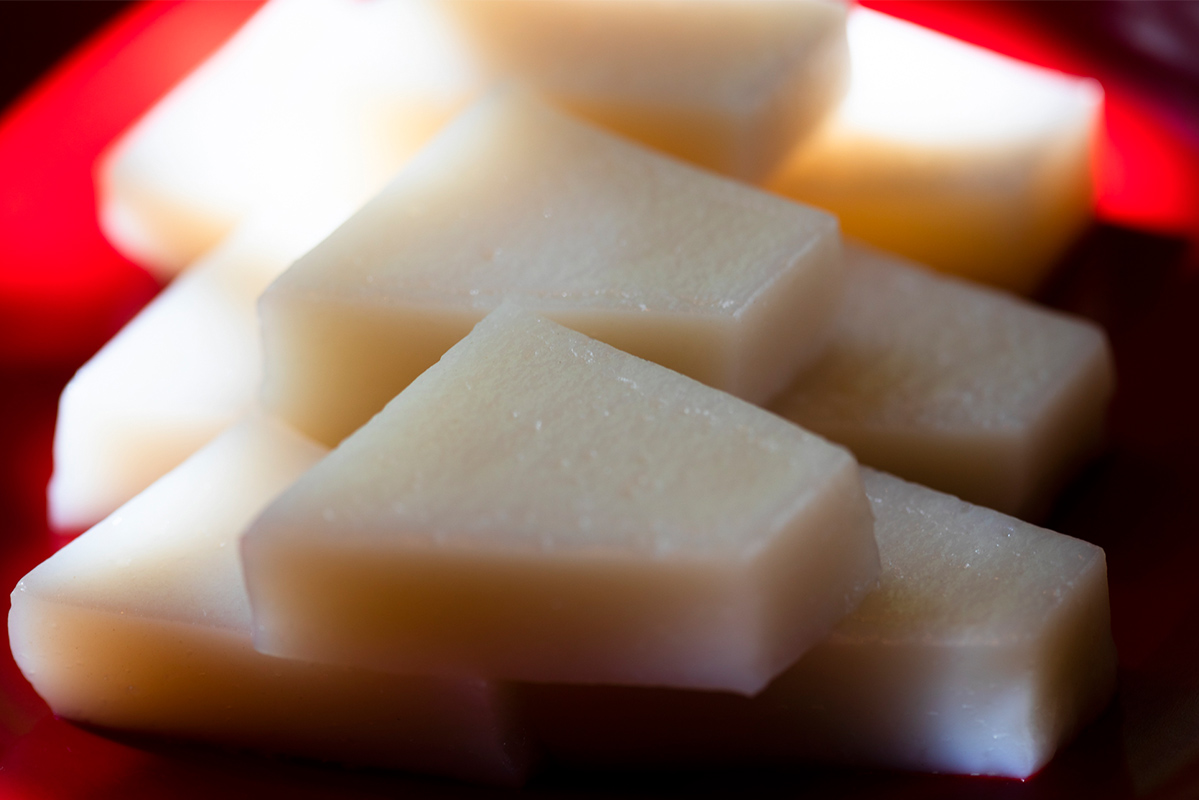 創業当時から変わらない、船橋屋のくず餅。しかし、時代背景にあわせて少しずつ変えてきたこともある。ひとつはくず餅のにおいだ。発酵食品独特の発酵臭や酸味を抑えるため、約5年前から洗いの回数を増やして誰もが食べやすい味にしている。もうひとつは、くず餅の味の決め手となる秘伝の黒蜜。以前はカラメル色素を使用していたが、職人たちの提案で「100%天然素材にしよう」ということになった。