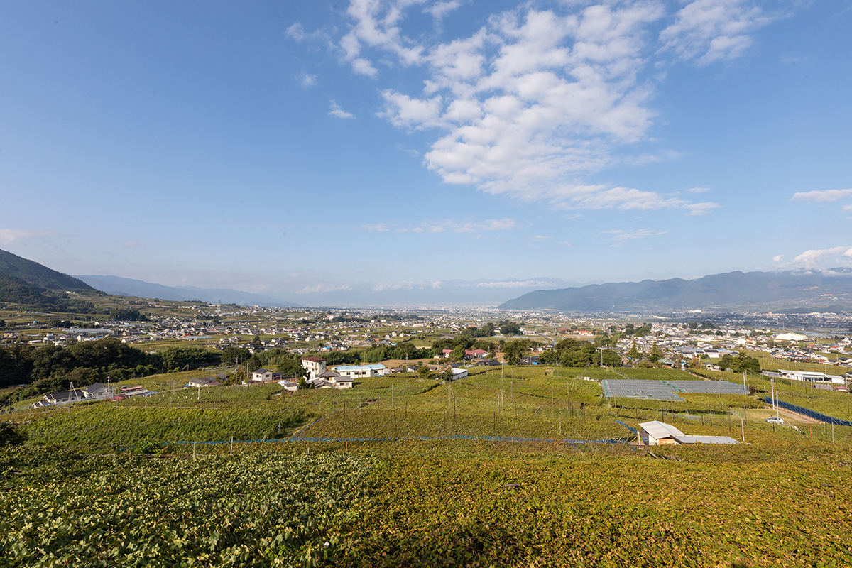 東京都心から車で約1時間半、中央自動車道の笹子トンネルを抜けて勝沼I.C.あたりまで来ると、目の前の風景が大きく開け、左右にグリーンのブドウ畑が広がるようになる。