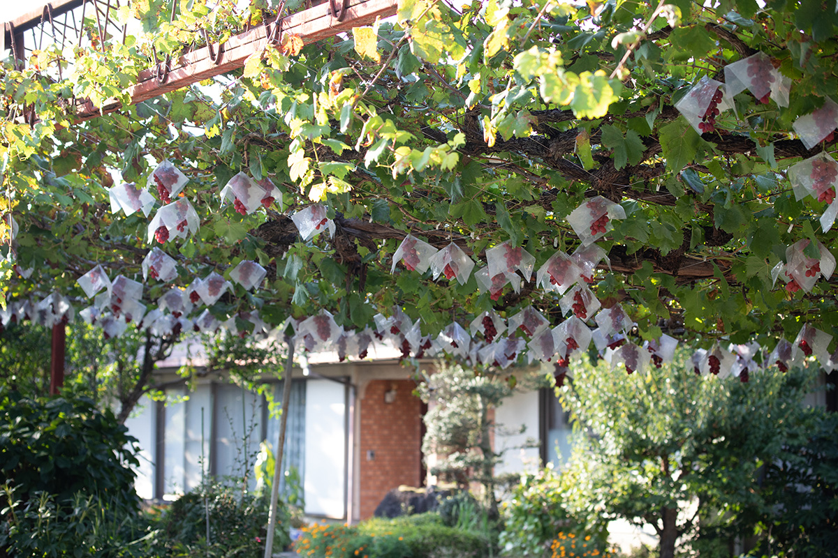 ブドウ畑とワイナリー、観光農園がひしめく勝沼の街なかを散策していると、民家の軒先に必ずといっていいほどブドウ棚が設置してあることに気付く。強い日差しを避けるためのブドウ棚は、いわば天然のバルコニーシェード。ブドウ棚の木陰で農作業にいそしんだり、のんびりとお茶を楽しんだりする光景はなんとも微笑ましい。奈良時代に高僧の行基がこの地に伝えたとされるブドウづくりは、1300年の時を経て、勝沼の人々の穏やかな暮らしぶりにしっかりと根づいているようだ。