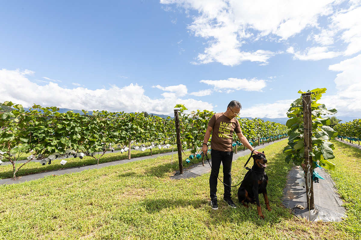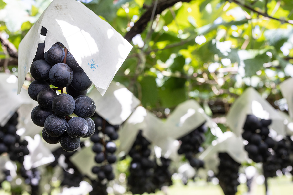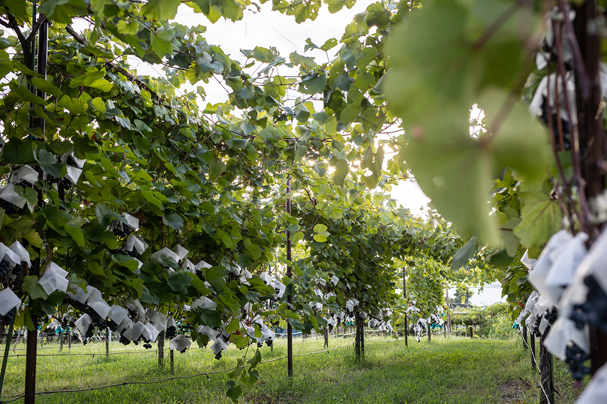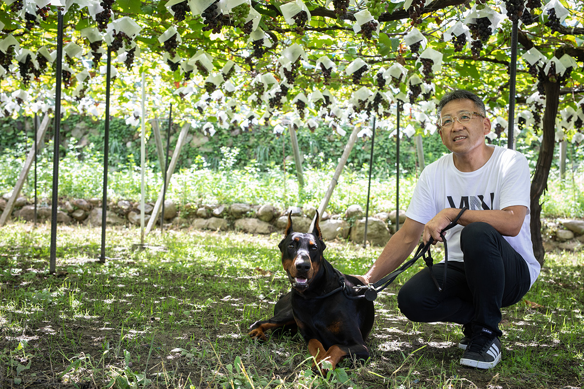 松坂さんが愛犬のルイスとともに案内してくれたのは、ワイナリーのすぐ横にあるブドウ畑。ワイナリー自体の住所は甲州市勝沼町等々力だが、小道を隔てたブドウ畑は笛吹市一宮町卯ツ木田となる。まもなく収穫を迎えようとしていたブドウの樹には、丁寧に笠がけされたブドウが美しく実っていた。訪れた日はまだ残暑が厳しい9月初めだったものの、ブドウの樹の木陰に入るだけで空気が涼やかに感じられた。