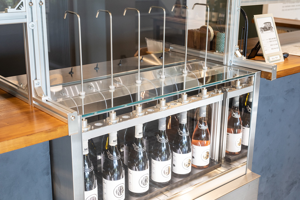 さて、ひと通りブドウ畑を見せてもらった後は、お待ちかねの試飲タイム。ワイナリーに戻り、エントランスを入って右手にあるテイスティングルームへと向かった。スタイリッシュな外観同様、ワイナリーの内装もすっきりとクリーンな印象にまとめられている。