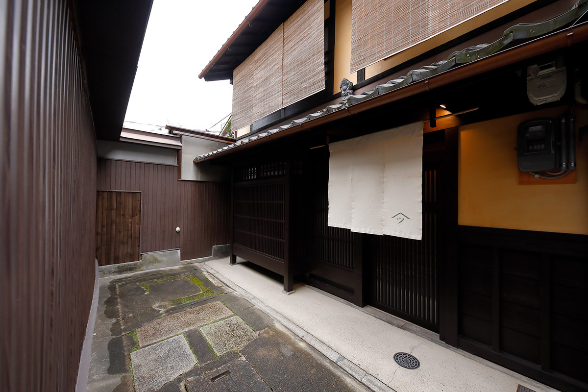 御所南の閑静な住宅街。初めてではなかなか見つけられない路地の奥に「HOSOO RESIDENCE」はある。苔むした石畳を辿ると、細尾の屋号が入った暖簾。コンシェルジュの田中幸喜さんが迎えてくれる。