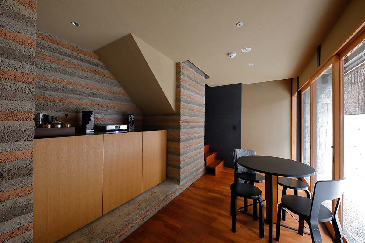 木や土壁など自然素材を多用し、工芸技術を駆使したこともそう。色の違う自然の土を下から順に積み上げていく版築(はんちく)という左官技術を用いた壁は、まるで平安時代の色合わせのように風雅で美しい。光の入り方によって違った雰囲気をつくる障子も、見ているだけで心が落ち着く。