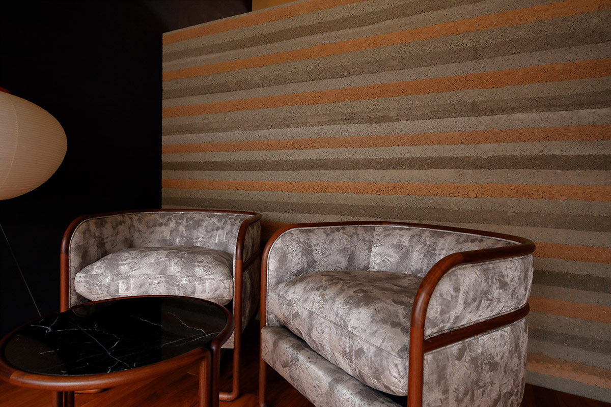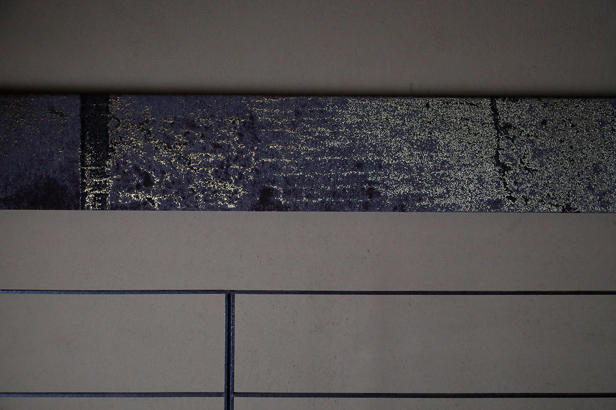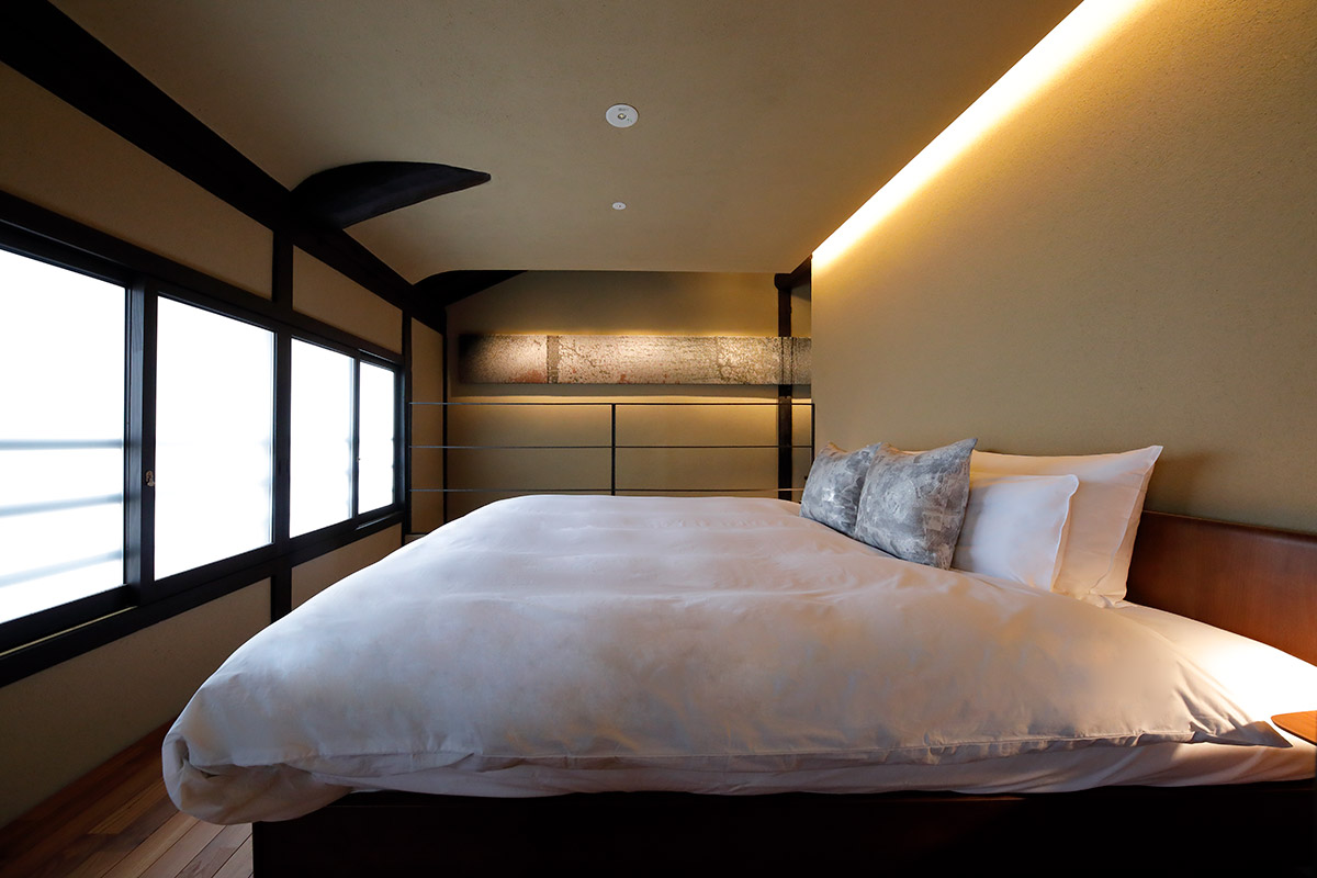 2階ベッドルームの奥に見える壁には、長い西陣織パネルが飾られている。「町家の内壁を記録撮影し、それを基に西陣織で再現しました。細かな土のかすれや凹凸のほか、昼の自然光や夜の照明に照らされて変わる表情を感じていただきたい」と田中さん。光によって見え方が変わるのも西陣織の特徴だと話す。