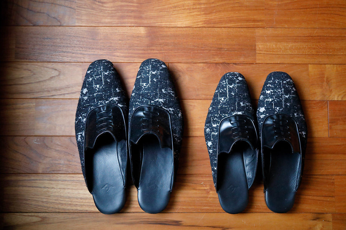 玄関から入ってすぐのスペースに置かれた白地に銀糸が映えるソファはオリジナル作品。座るとその快適さを体感できる。室内で履くシックな黒のルームシューズも心地よく、欲しくなる一品だ。