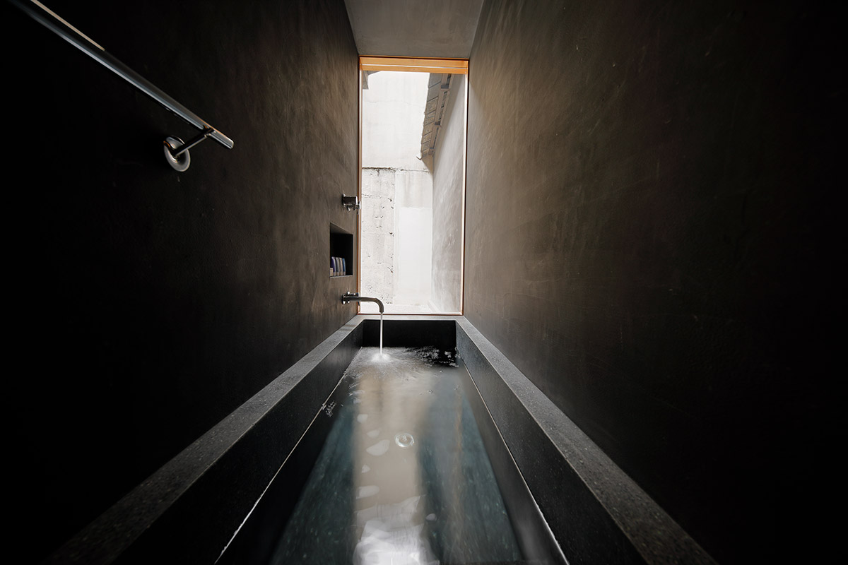 「バスルームなど水回りにも工芸技術を用いています。黒漆喰の壁のほか、研ぎ出し技法を用いた石のバスタブを備えました」と田中さん。細部まで気を抜かずに考えられた設計なのだ。