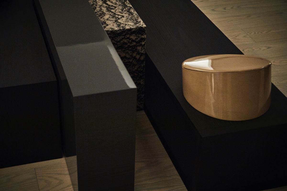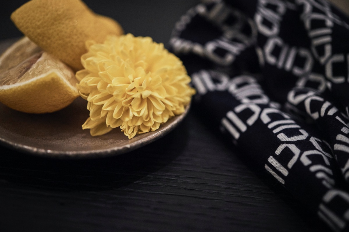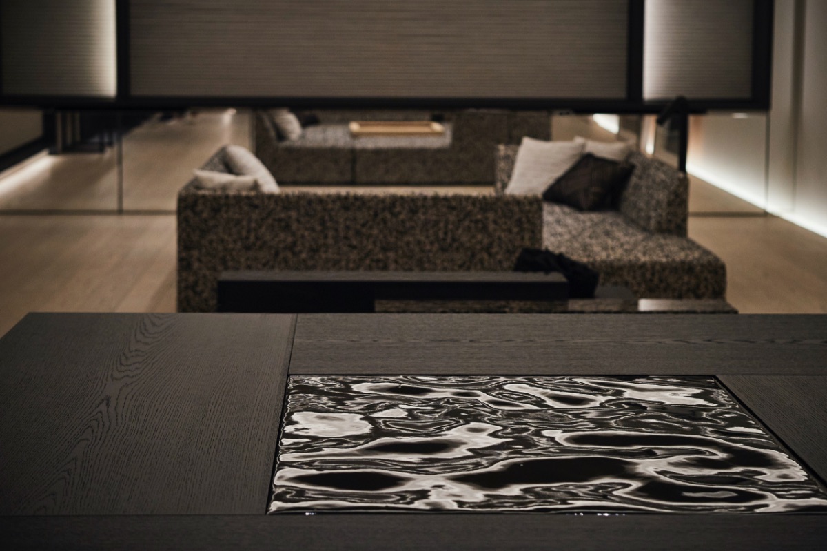 和食器が馴染む漆黒の大きなダイニングテーブルは、この部屋に合わせて夫がオーダーした。波打つ水面のようなセンターのデザインは彼のお気に入りで、まるで凪(なぎ)の海を眺めているようで不思議と落ち着く。3人で使うには少し大きいけれど、コーナーを挟んで座ると、正面から向き合うよりもよりリラックスできる気がして会話がはずむ。