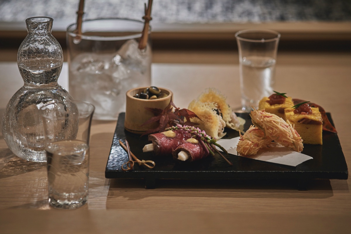 乾杯の肴は、トレーにのせてソファの真ん中に。きっといつものように、胡座(あぐら)でくつろいでちびちび飲むに違いない。浸し豆と梅入り玉子焼きは、我が家の定番。お弁当にもよく入れた、懐かしいおかずだ。今日は、海老のそうめん揚げと牛肉のたたき、それと、里芋のおつまみを添えた八寸に、おいしい日本酒を用意しておいた。