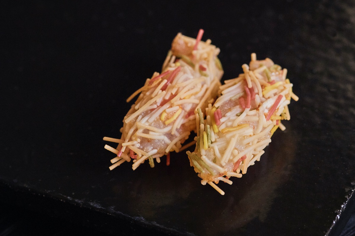 2.そうめんを1の表面に貼り付け、160℃に熱した油でこんがり揚げる。
