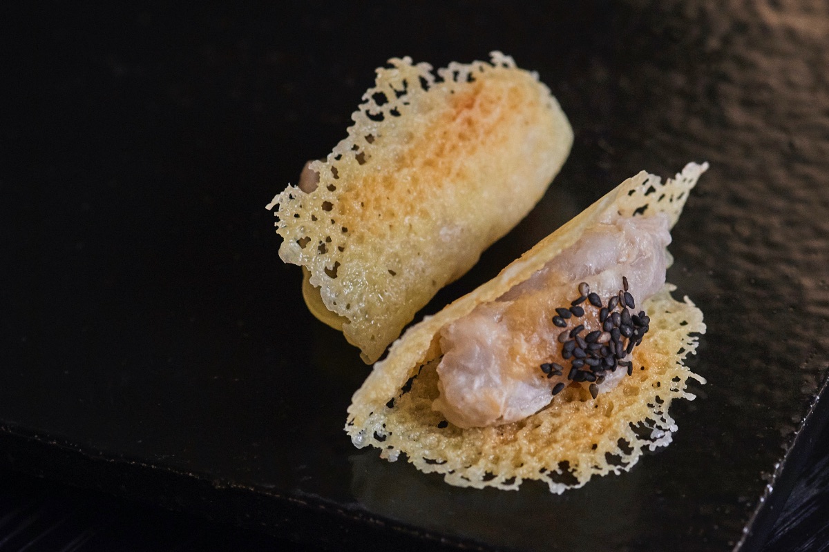 3.2が熱いうちに、中央に1をのせて黒ごまをふり、手早く半分に折る。
