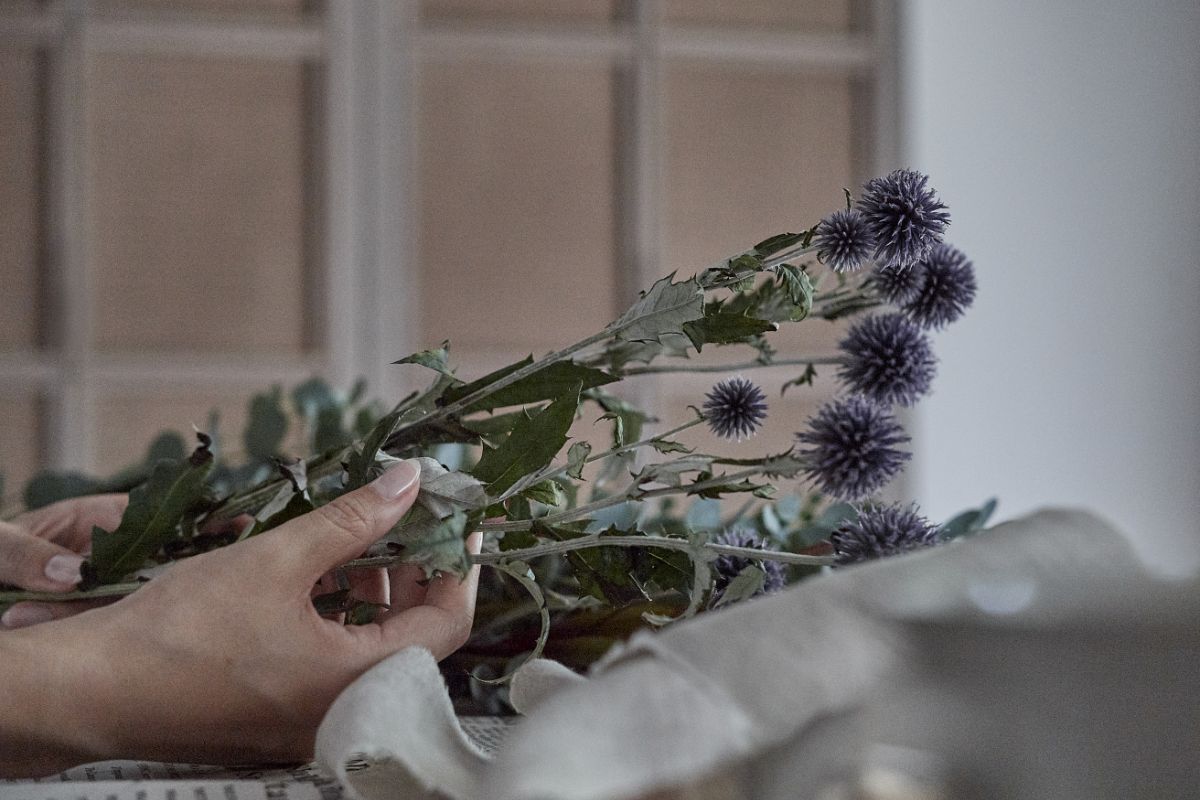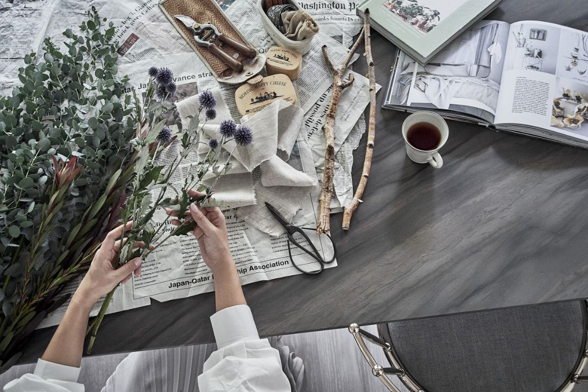「彼女のお店でね、スワッグのレッスンをしていたの。そこでちょっと教えてもらったから復習しようかな、と思って。グリーンやお花を仕入れてきたから、ダイニングでコーヒーでも飲みながらのんびりやるわ」