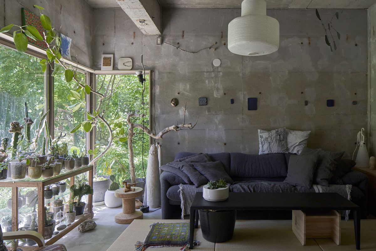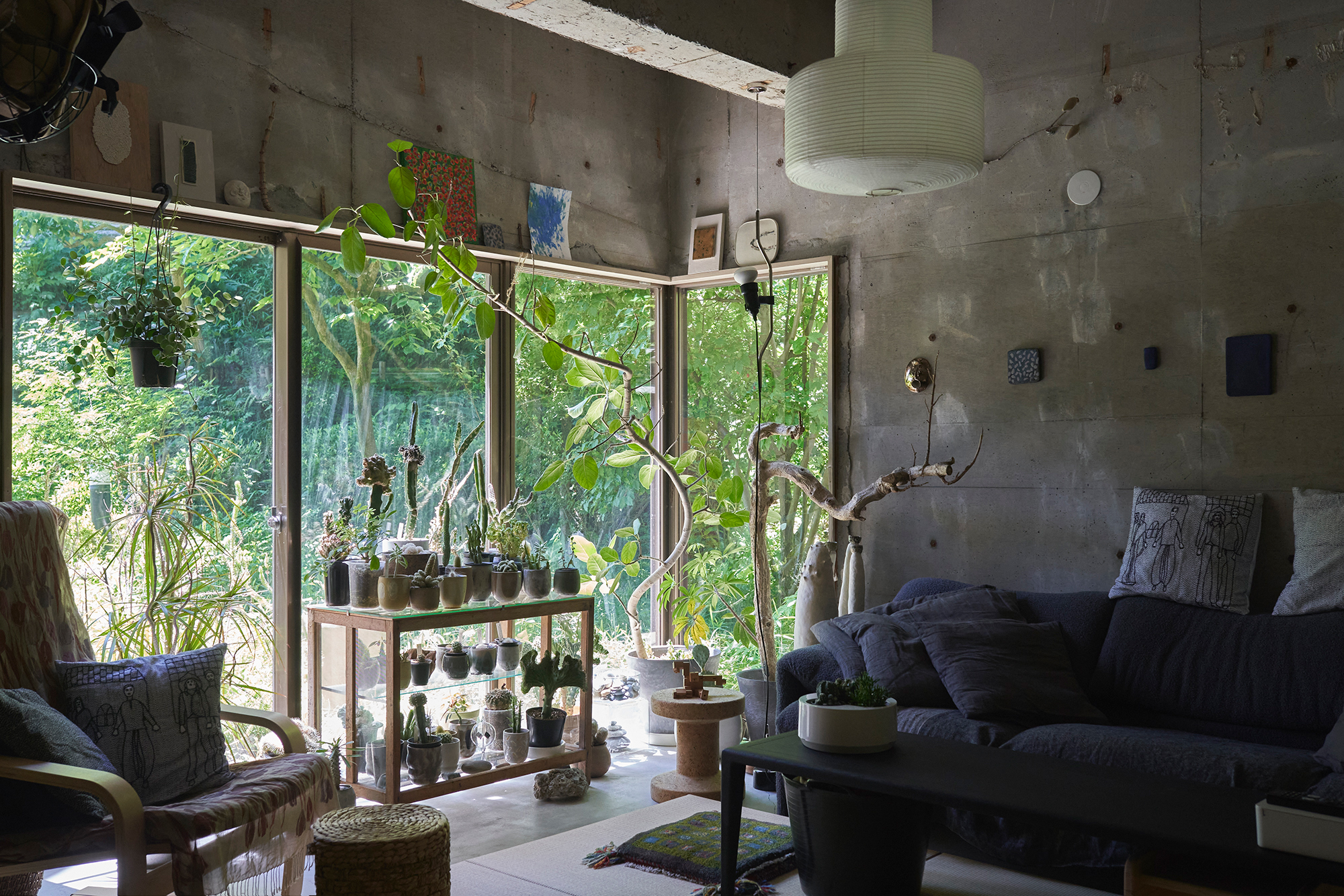 まずは、家族が多くの時間を過ごすリビング。ソファはカッシーナの名作「マラルンガ」を使用。「私の実家から譲り受けたもので、テキスタイルも購入時のままです」。織りの凹凸が豊かな質感のテキスタイルで、空間のアクセントになっている。コーヒーテーブルはタイム アンド スタイルのもの。ファサードに沿ったL字の掃き出し窓の近くには、自身の作品に数多くの植物を置いて育てている。