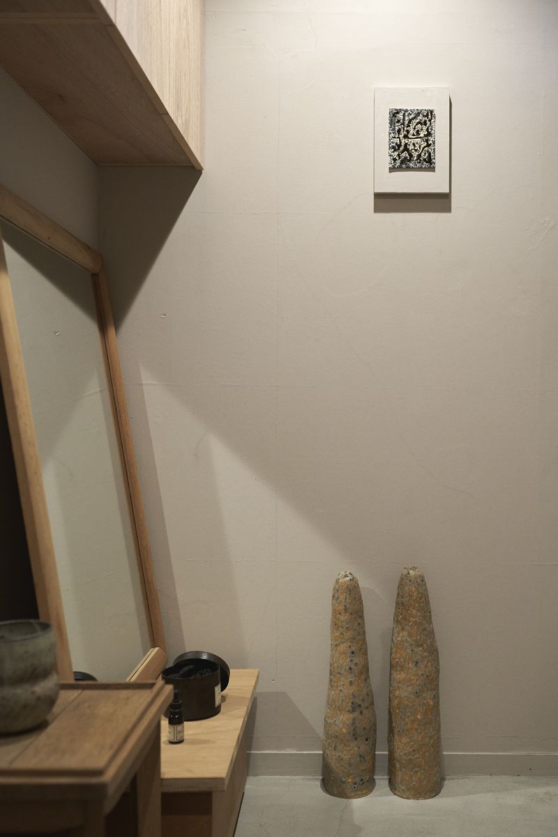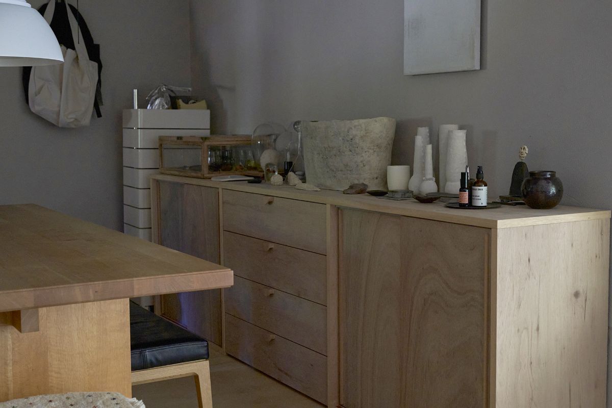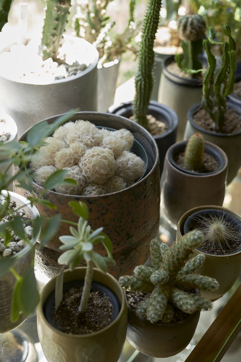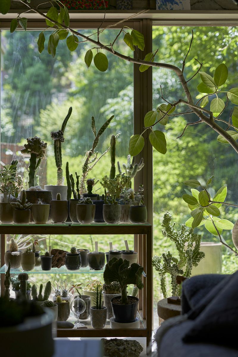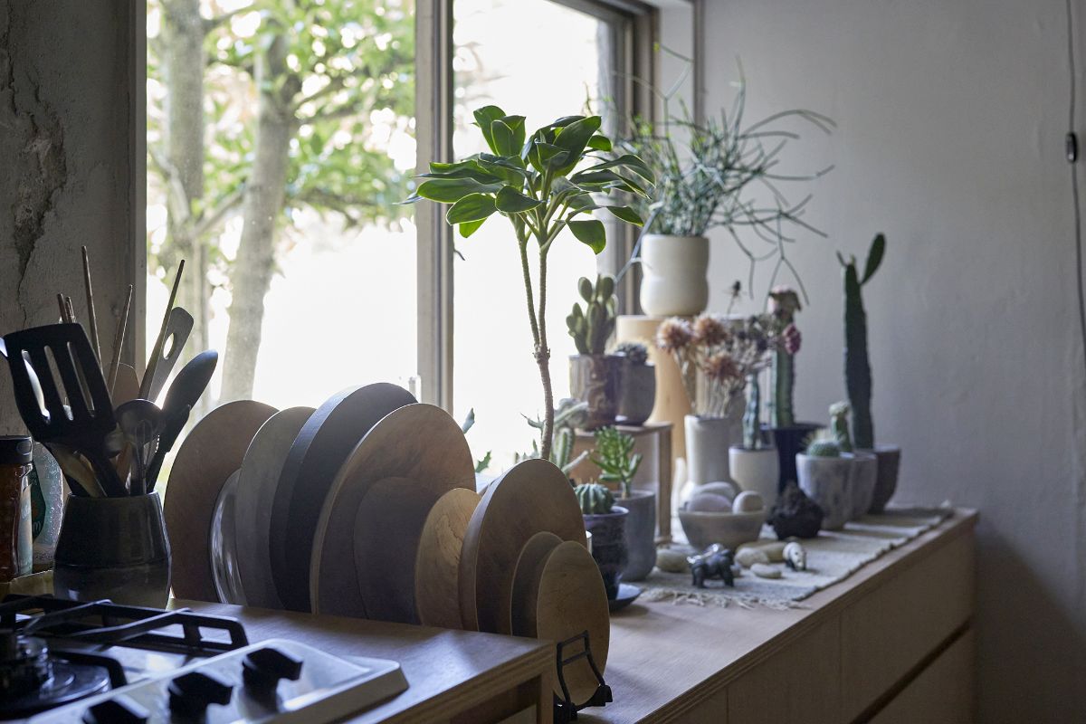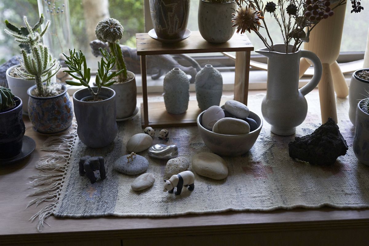 住まいには、自身の作品やグリーン、コンテンポラリーなデザインアイテムまで、さまざまな時代や背景を持つものが、彼女の美への探求と、暮らしへの優しいまなざしによって一体となっている。「ちょっと趣味が変わってきて。以前は古道具が多かったんですが、最近はモダンデザインも増えてきました」と鈴木さん。