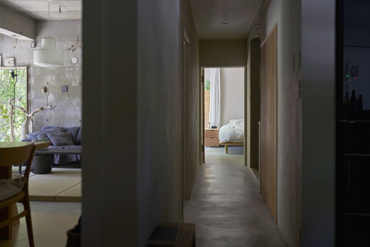 もともと和室だったというダイニングの床には、少し高さのあるラワン合板を設置することでゾーニング。反対側に位置するリビングには、最近になって琉球畳を設置したそう。「子供がはい回るので、モルタルだと不安だな、と感じて。畳が意外にもしっくりきたのでよかったです」。そう鈴木さんが話すように、最小限に仕上げた可変性のある空間が、さまざまな要素を寛容に受け入れている。