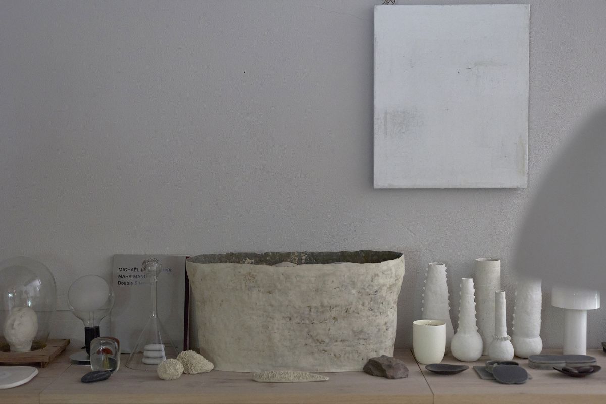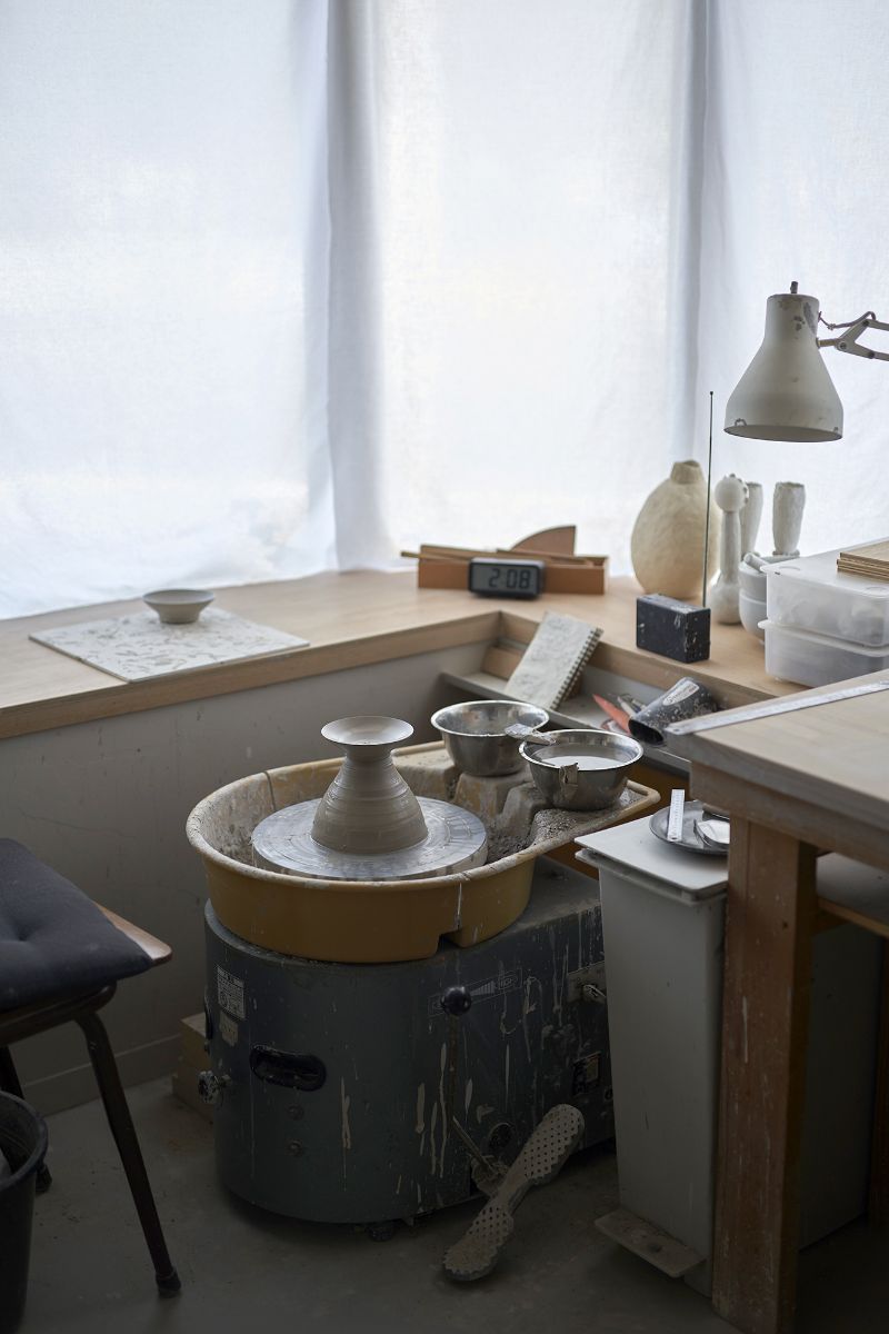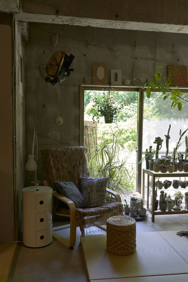日中、柔らかな日が差し込む自身のアトリエで過ごすことの多い鈴木さん。この場所に入ると、一気にモードが切り替わり、集中できるそう。「夫も普段、家で仕事をしていますが、それぞれ作業を行う場所が分かれていて、お互いよい距離感で仕事に向かっています」と鈴木さん。「何より、私たち家が好きすぎて(笑)。全然外で仕事したりしないんです」と笑う。