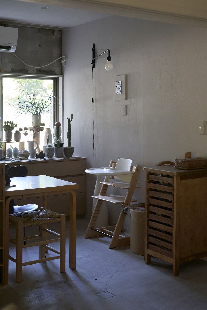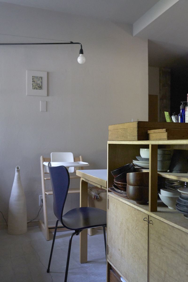 キッチンは、造作のカウンターを最近になって追加した。「製作したものだけじゃなく、器も好きなので、だんだん収納も手狭になって」と鈴木さん。簡単な食事を取るためのアルテックのテーブルや、フリッツ・ハンセンの「セブンチェア」も最近買い足したもの。「でもキッチンの真ん中に置いているカウンターは、以前の住まいから使っているものです。手放そうと思っていたんですが、結果的に収まりがよくて」。
