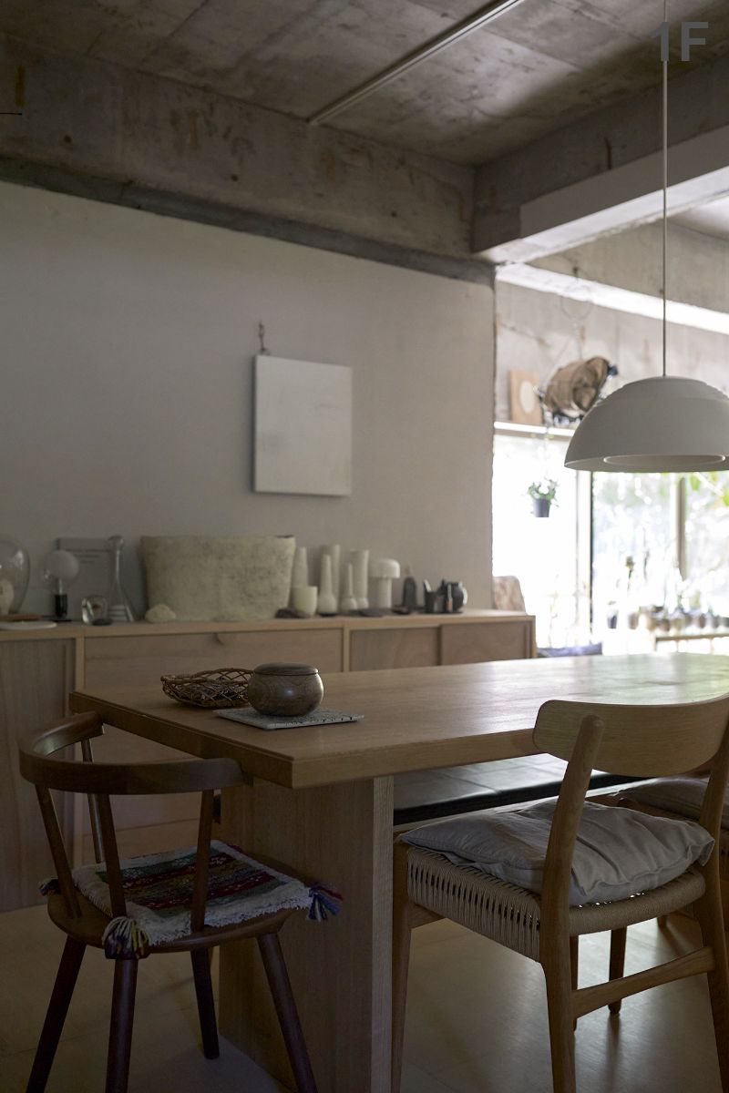 ダイニングテーブルは、食事だけでなく、鈴木さんや在宅勤務の多いご主人が仕事をする場所でもある。タイム アンド スタイルで購入したというオーク材のテーブルは、シンプルながら木の存在感をダイレクトに感じられるもの。カール・ハンセン&サンのチェアなど、木工のシンプルな名作を選ぶことで、小物の変化にも柔軟に対応できるような構成になっている。