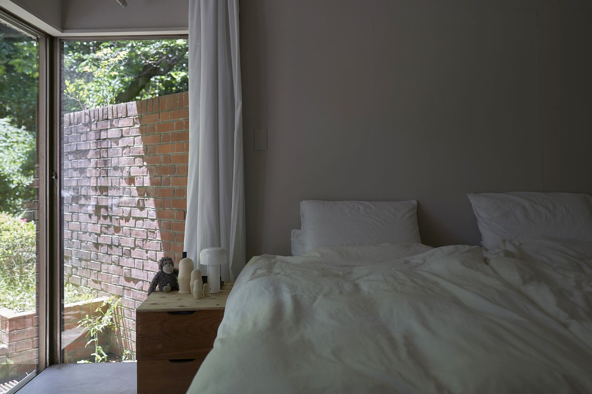 そして寝室。ベッドに寝転ぶと、専用庭から周囲の緑までを一望でき、都心からほど近い住宅街とは思えないようなリラックス感に溢れた風景が広がる。