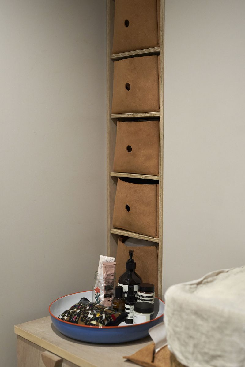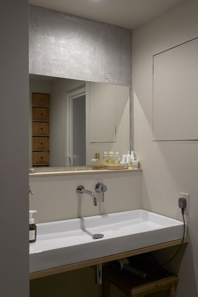 「実は、特に気に入っているのが洗面スペースなんです。フォンテトレーディングで購入したシンクは、壁面にピッタリ設置できるものをセレクトしました」という鈴木さん。壁と壁の間にフィットするシンプルな長方形のシンクは、水はねが気にならず掃除も楽。小さなお子さんの汚れものを手洗いするにも重宝しているそう。さらに、壁面の収納棚には、レザーブランドのhueにオーダーした革の収納ボックスが。「素肌で過ごす場所なので、あまり硬いものは置きたくなかったんです」。タオルや洗剤などをスッキリと収納しながら、インテリアに手仕事ならではの素材感を与えてくれる。
