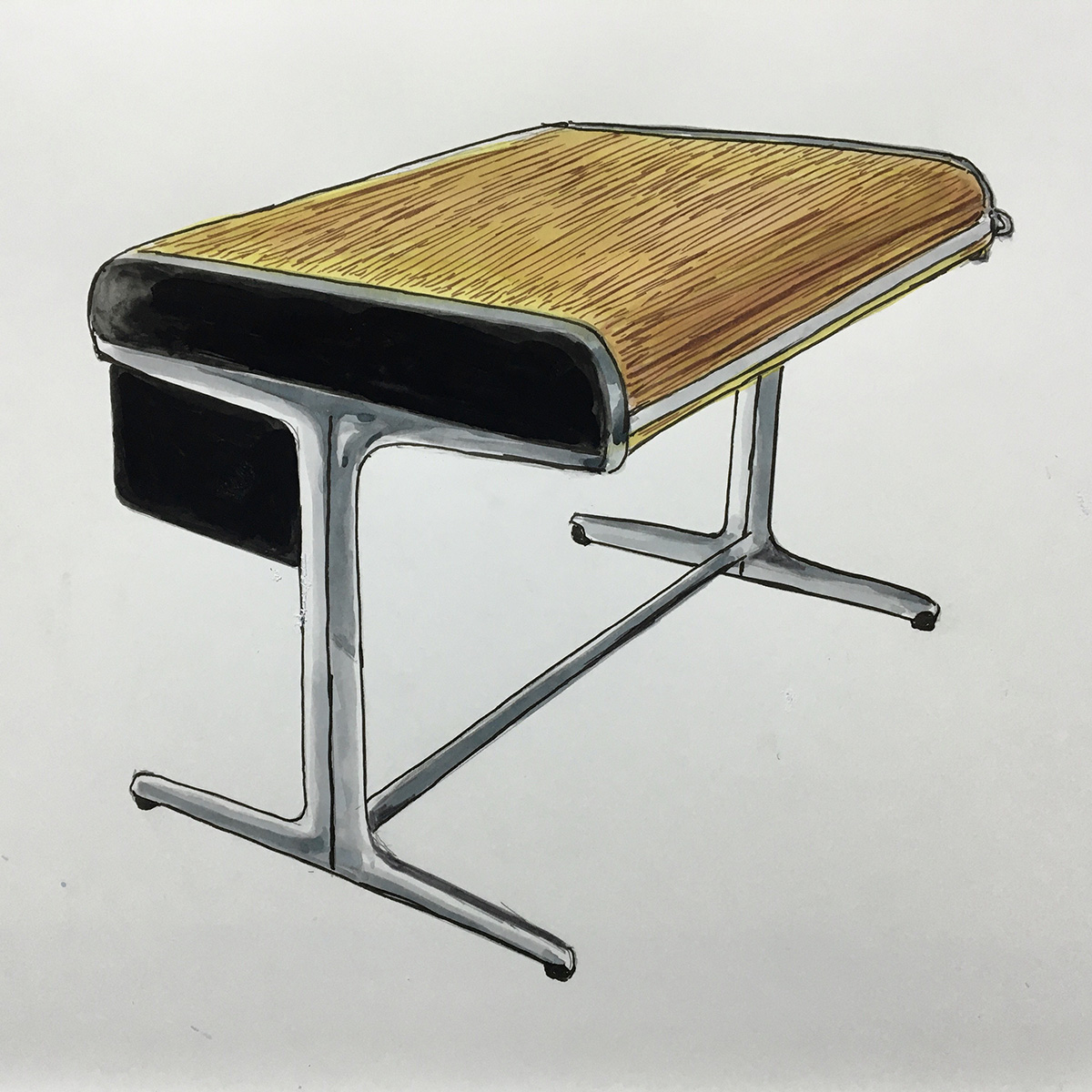 ラウンジの場面ではピンクの制服を着た女性スタッフがレセプション・デスクを前に腰掛けているが、この机も赤い椅子と同じようにミッドセンチュリー・モダンクラシック・デザインのもの。ハーマン・ミラーの1964年の作品。映画では白い化学素材のデスクトップになっているが、ジョージ・ネルソンがデザインしたものはウォルナット(くるみ)材を使用している。脚部はクロームのスチール。