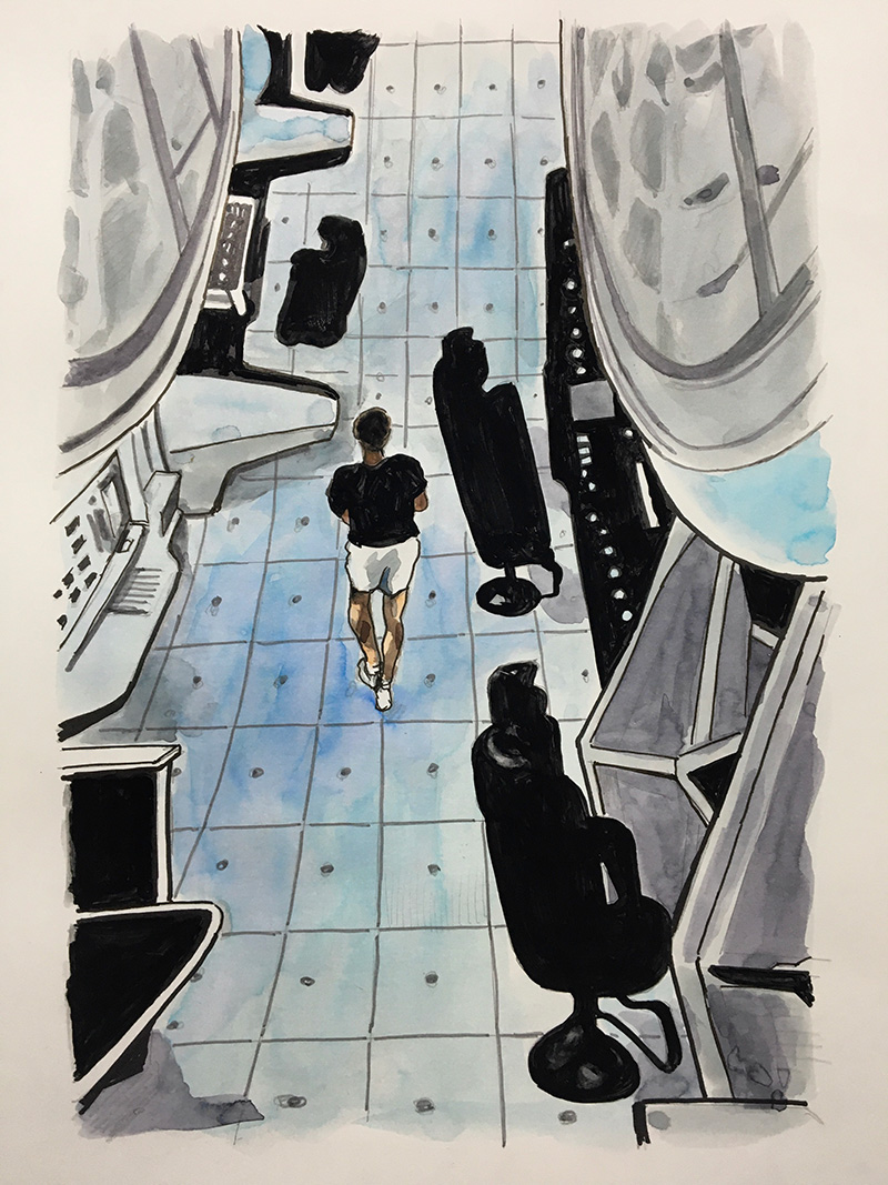 それから1年半後、木星調査計画が始まる。捜査船ディスカバリー号のクルーが運動不足解消のために人口重力スペースでジョギングをするシーンがある。白一色のメカニカルな内装に黒の椅子がアクセントになっている。紫外線浴をするリラクゼーション・ルームや、宇宙食を摂るカフェテリアのインテリアも、すべて徹底して白一色に規定されている。ちなみに使われているカトラリーはデンマークのジョージ・ジェンセン。デザイナーはアルネ・ヤコブセン。シンプルで洗練された未来的デザインはこの映画にマッチしている。