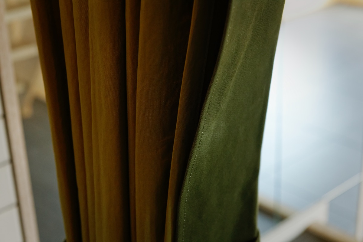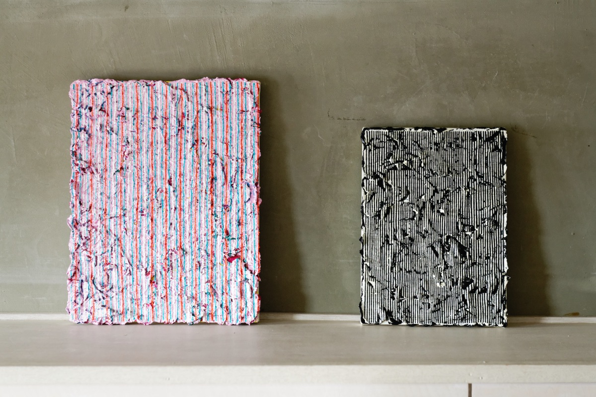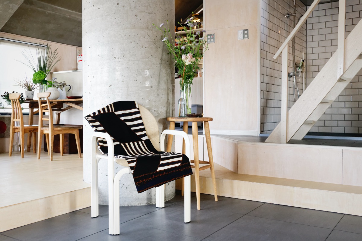 「ここは作家の仲間と一緒に考え、つくった空間なんです。例えばバスルームのカーテンは、テキスタイルを手掛けるオランダ留学時代の友人と相談して、何度も試作を重ねて制作しました。窓側のソファに置いているクッションカバーも友人のグラフィックデザイナーが作ったモチーフです。CAVEでも展示をしている中村太一さんや、赤羽史亮さんのペインティングも部屋のポイントになっていて、仲間の作品を生活に取り組むことはいいエネルギーになります」