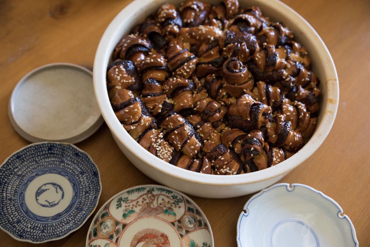 イスラエルの文化を日本に伝えるという使命を持つアリエさんは、イスラエルの料理を紹介するイベントの企画などもたびたび行ってきた。元々料理が得意なアリエさんは、ステイホームが増えた昨年から、自宅でお菓子やパンを焼く機会も増えたと言う。取材の日はイスラエルの代表的な菓子パン「ルゲラー」をふるまってくださった。信楽の磁器に生地を敷き詰めてそのままオーブンで焼く。取り皿は有田や益子、各地で手に入れた骨董の小皿。イスラエルと日本の文化がテーブルの上で融合したかのようである。