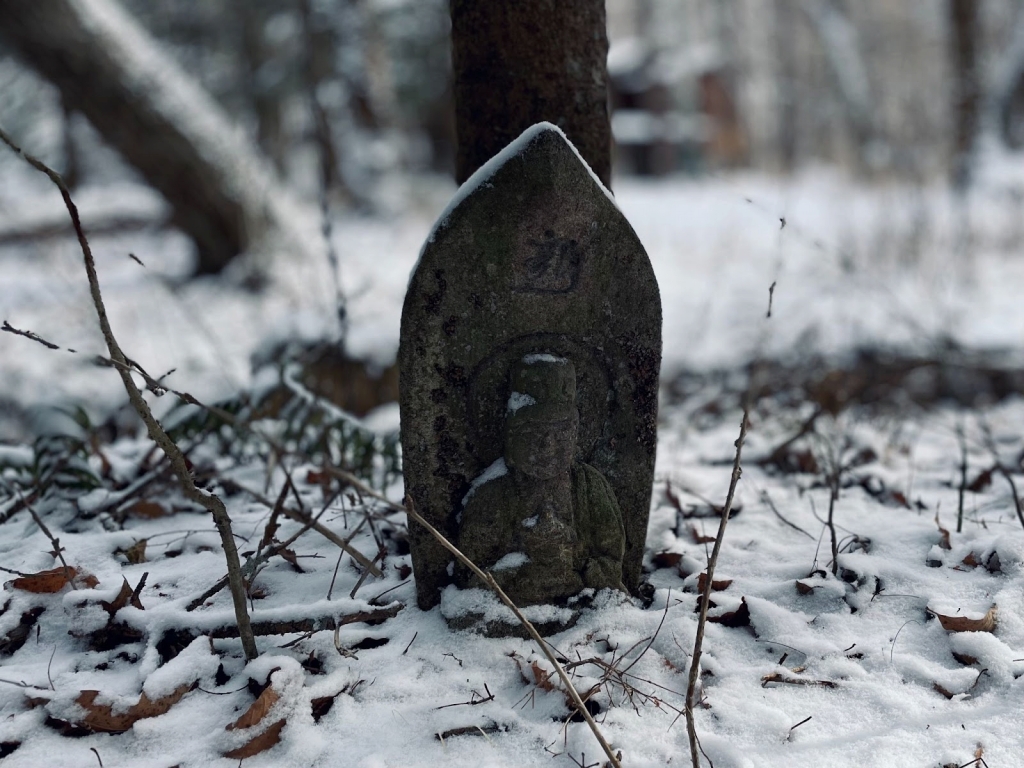 あと、軽井沢にある僕の小屋の庭には、杉本さんの作品のモチーフとしても頻出している五輪塔を抱えた古い仏像を置いています。こちらも某オークションで購入したもので、梵字(サンスクリット文字)で「アーンク」という「第一のもの」という意味の文字が刻まれていて、大日如来という一番の仏様だろうというところまでは分かったのですが、それ以上の委細は不明です。でも、なんだかご利益もありそうで、いいのですよね。雪景色にも馴染んでいます。