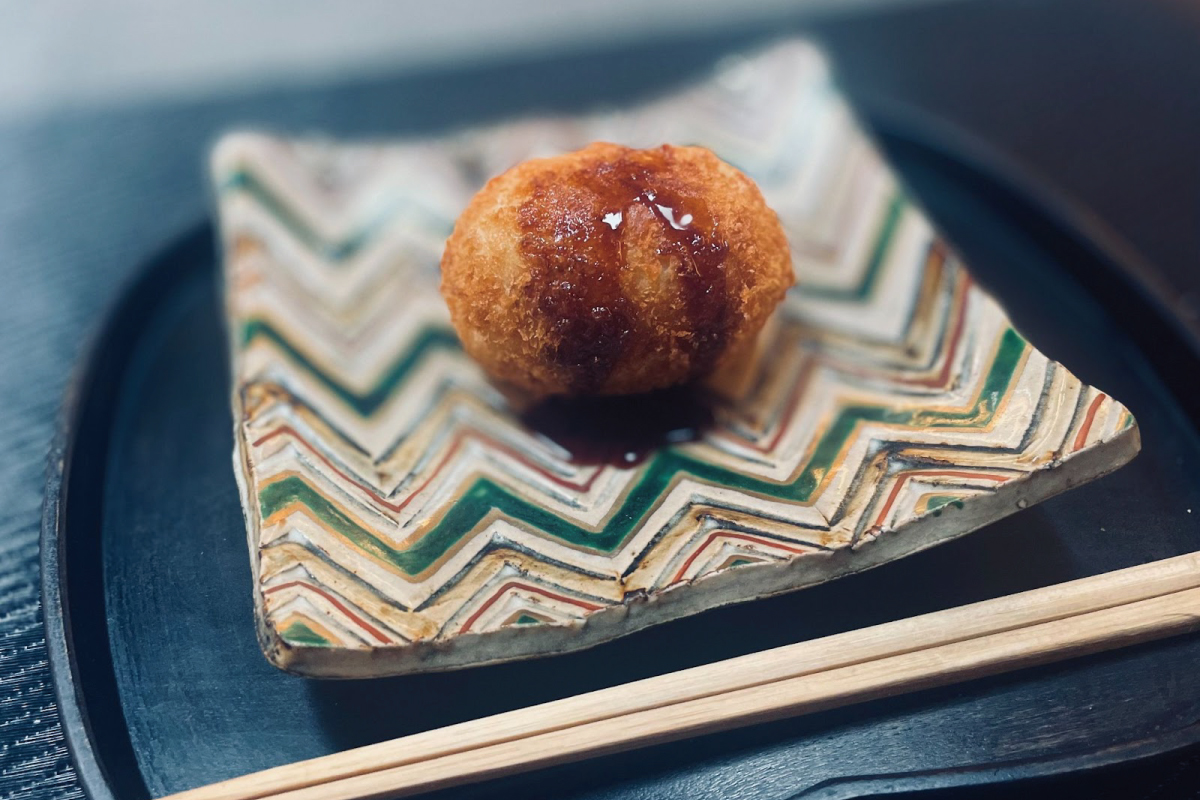 下の写真のこちらの平皿は以前からうちで使っている志音さんの作品ですが、こちらは北大路魯山人の作品がモチーフになっている部分もありながら、写しではなく志音さんのオリジナルです。僕の自作のコロッケのような平易な料理に使っても、やはり引き立ててくれる度合いが群を抜いています。