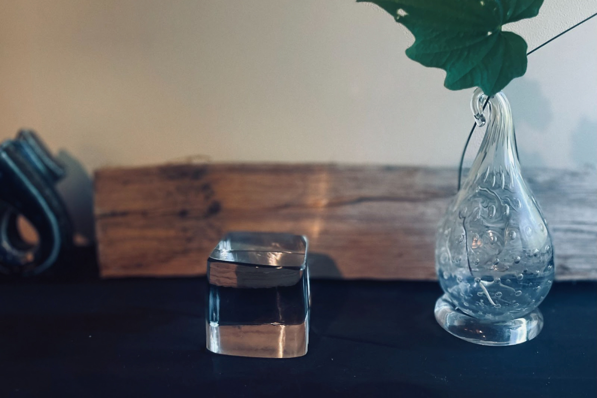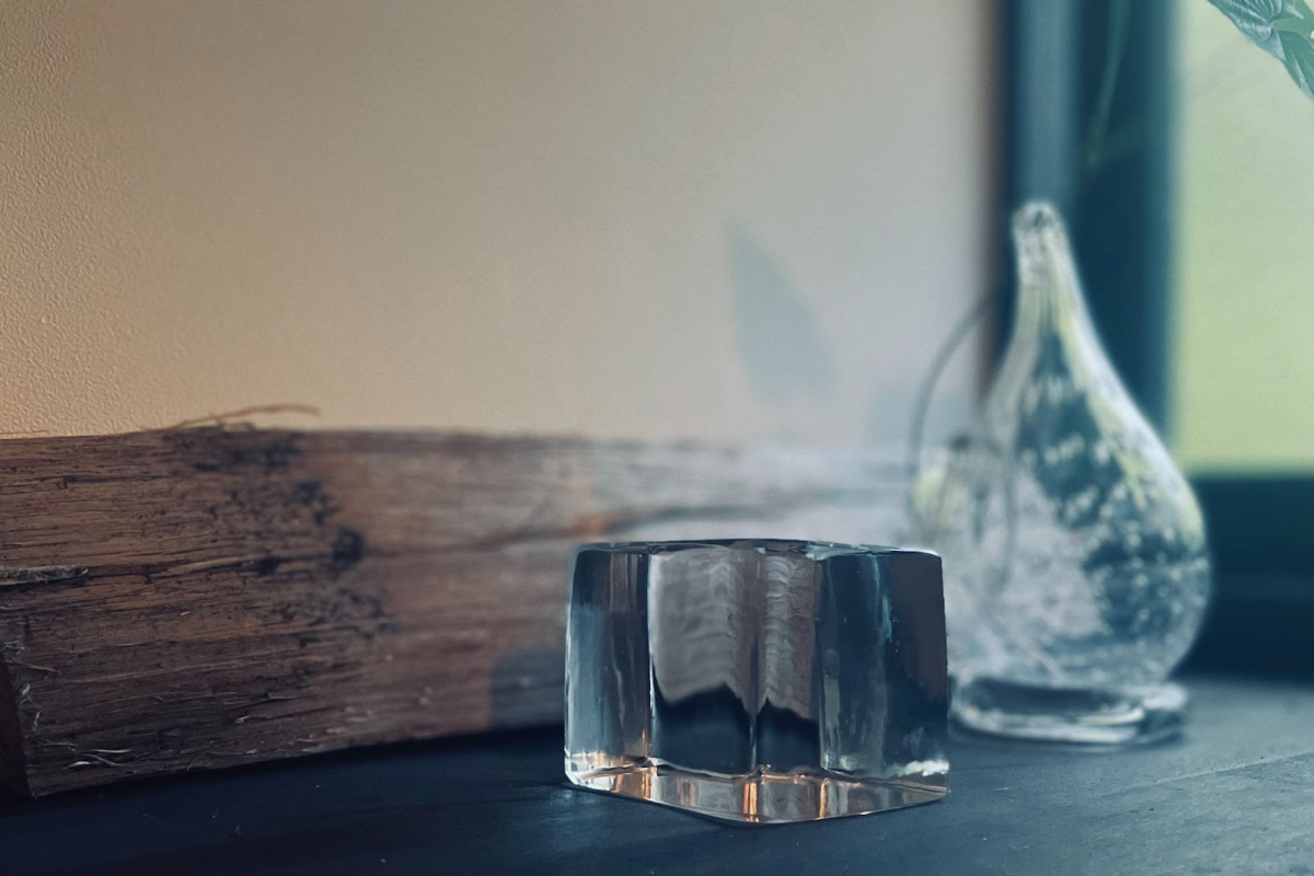 今回ご紹介するのは、ボッテガ・ヴェネタのプロジェクトにあわせて制作されたガラスの四角いオブジェで、以前から持っていた小さな花入れのようなオブジェと並べて玄関に飾っています。