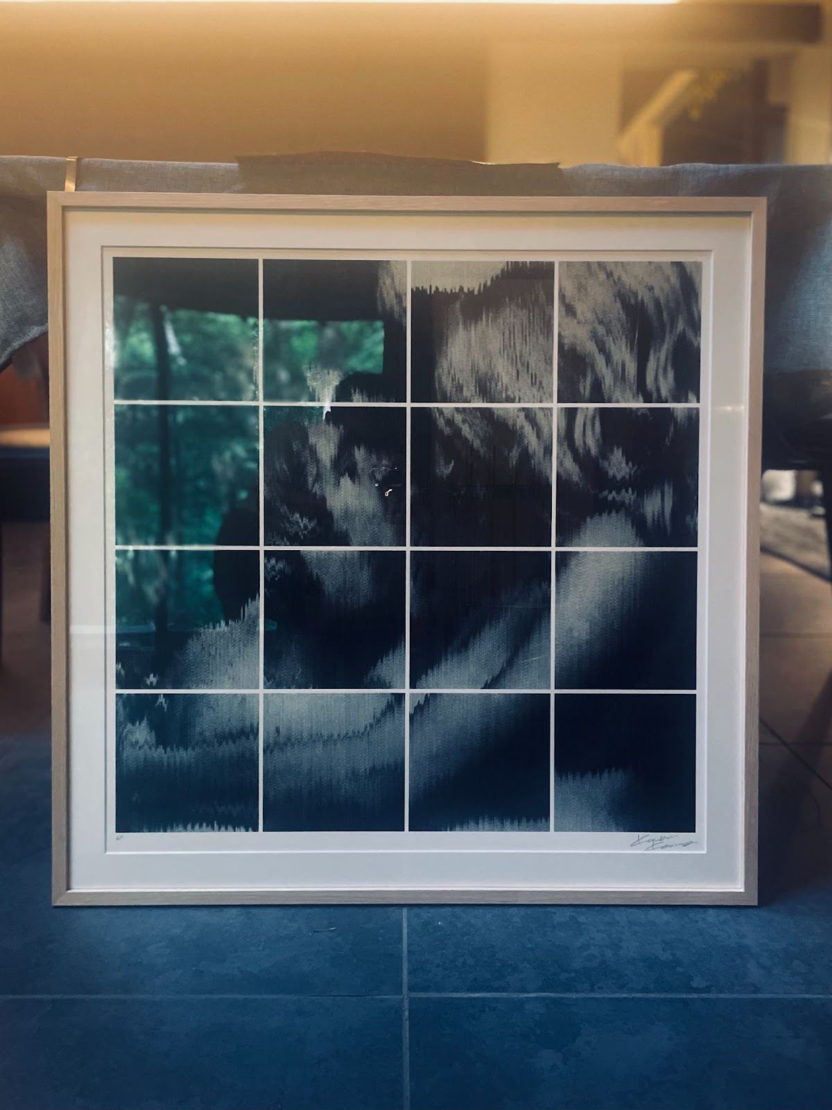 2枚の写真を見比べてもらうと、オリジナルの作品のイメージも伝わるのではないでしょうか。シルクスクリーンに映り込んだ緑は作品の色味ではなく、うちの庭の木々の葉が映り込んでいるものです。この自然のコラージュも意外にいい塩梅でとても気に入ってます。