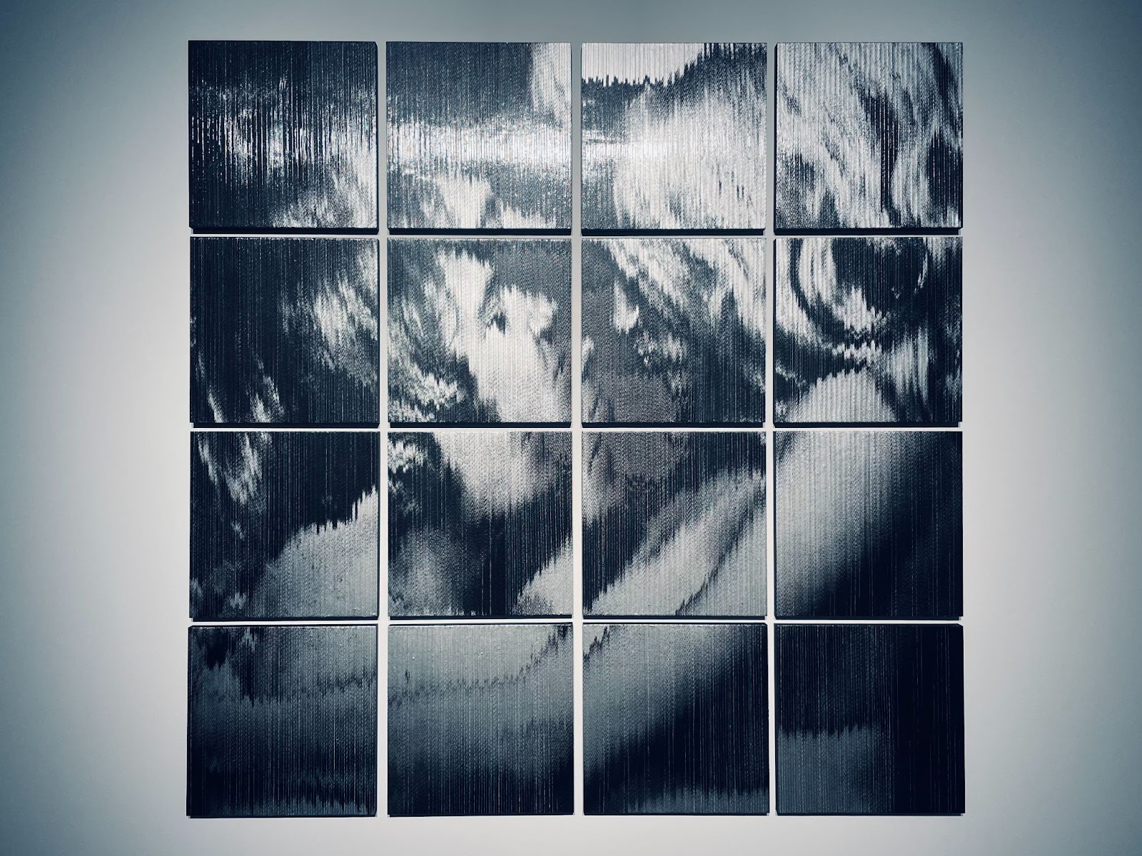 70年代のロックシーンのモチーフにゼラチンシルバーのような色味がマッチしていて、そこにコラージュの雰囲気が絶妙にはまり、そして画面が16分割されているのもまたいいのですが、上記のエキシビションで展示されていたオリジナルの作品(下記の写真)は16枚それぞれバラで制作されたものがこのようなレイアウトに配置されていたのです。