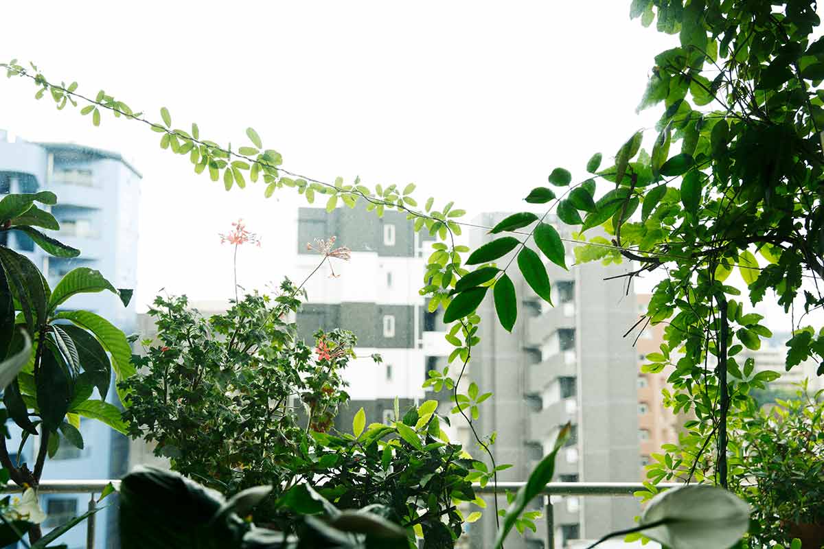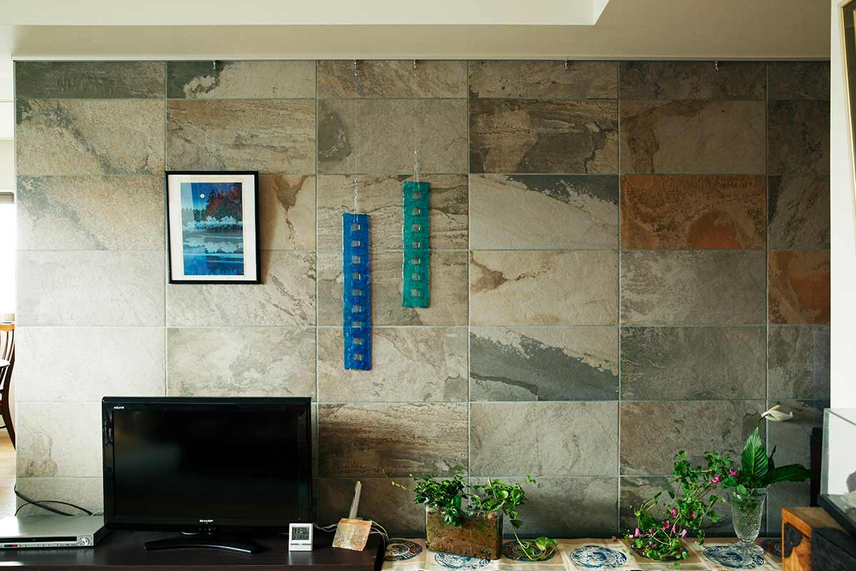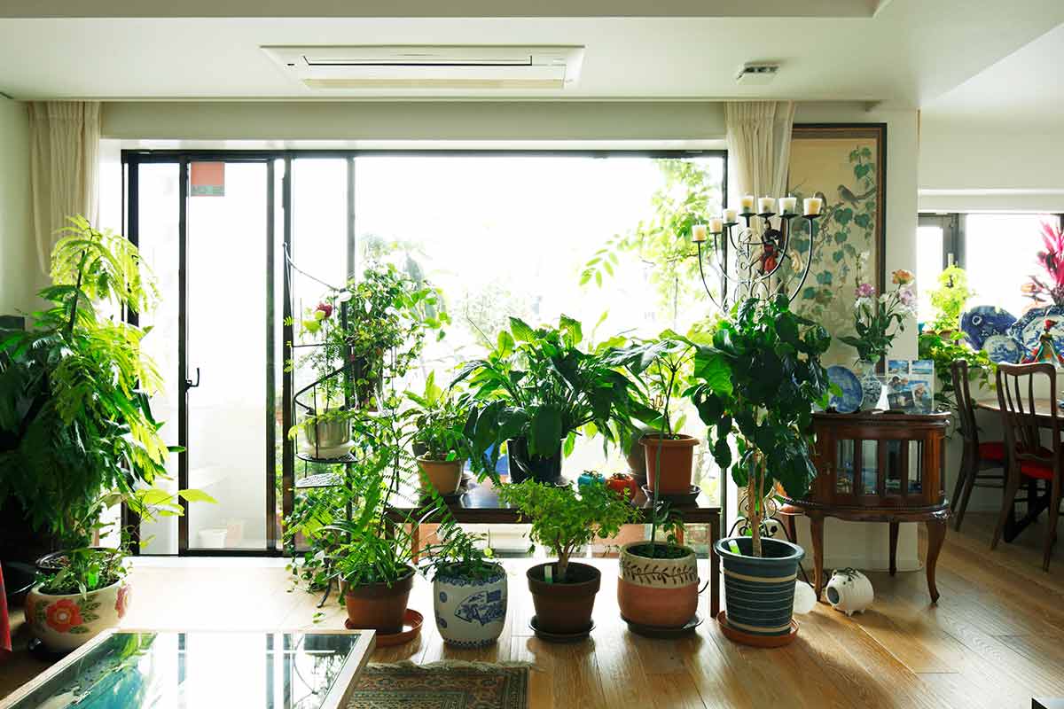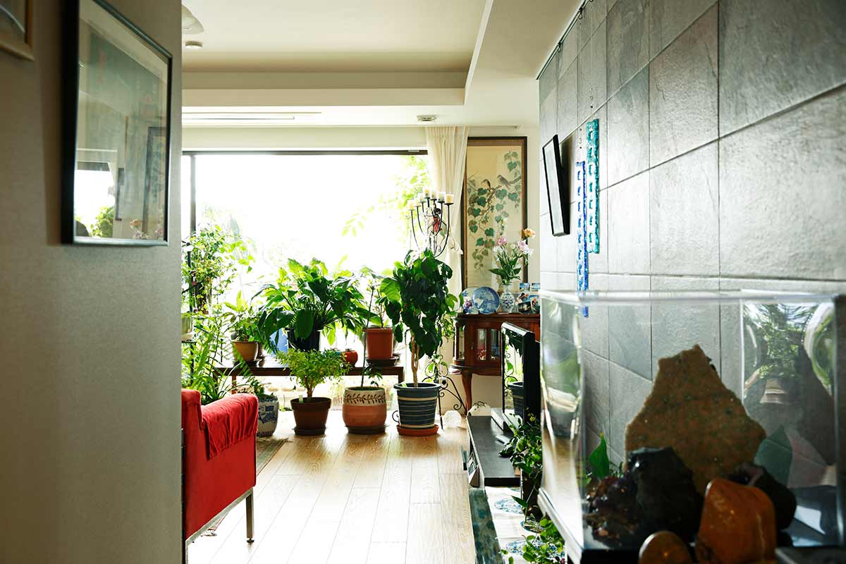 「初めて見学に来たとき、玄関のシルバーの壁とリビングダイニングの石壁に、絵を飾りたいと思いました。それもこの物件を選んだ決め手の一つです。最近では植物を集めるのも好きになりました。この家は南側にバルコニーがあって、リビングダイニングが広いですから、南側の窓辺にもたくさんの鉢を並べています。室内でも良く育っていますよ」(ご主人)