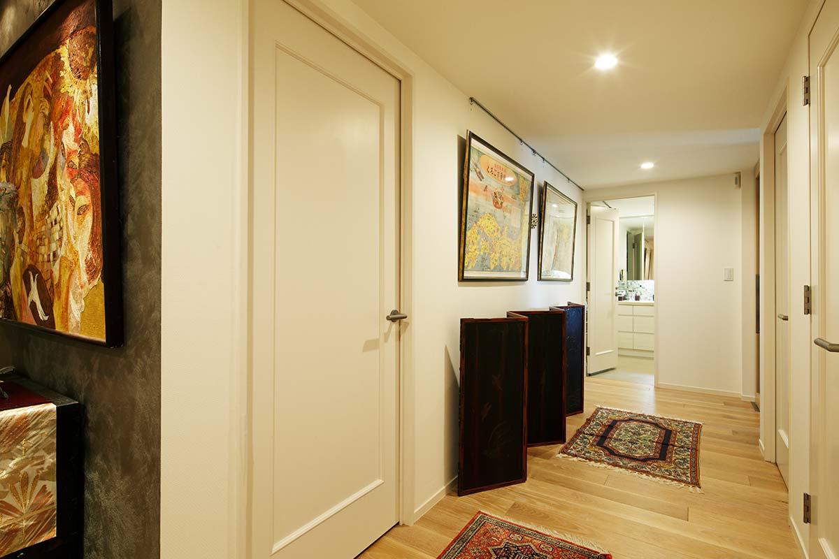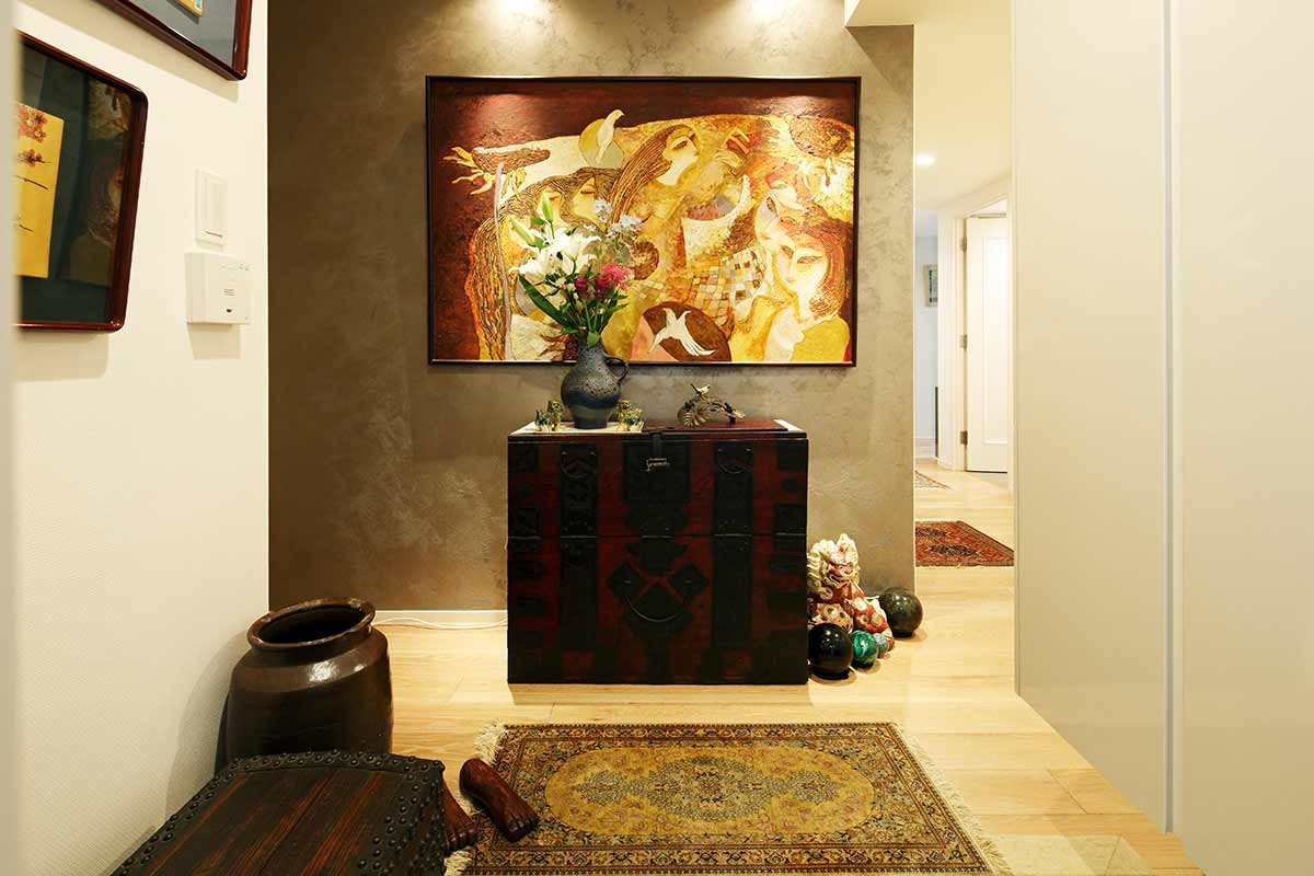 「物理的にものが多すぎて、以前の家は広さが足りませんでしたから、面積が十分に広いことが一番の条件でしたね。大きめの絵は飾る場所がなくて、細くて長い廊下に飾っていて、斜めからしか観賞できない状態でした。この家は廊下が広いから、絵も余裕を持って飾れます。築30年の物件ですが、当時は最先端の高級マンションで、贅沢の象徴として廊下などが広々とした造りになっているのだと思います」(奥さま)