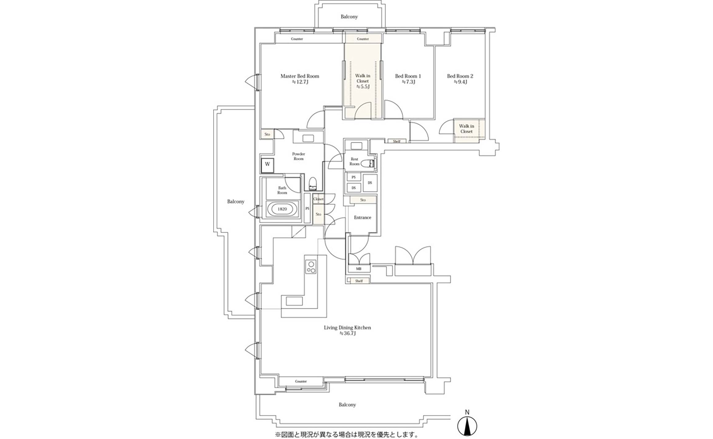 Master Bed RoomとBed Room1の間に両室から使用可能なウォークインクローゼットを設けることで、2室の収納量を確保しつつ、各部屋の面積も確保。2室どちらからも利用できることで利便性も高めている。