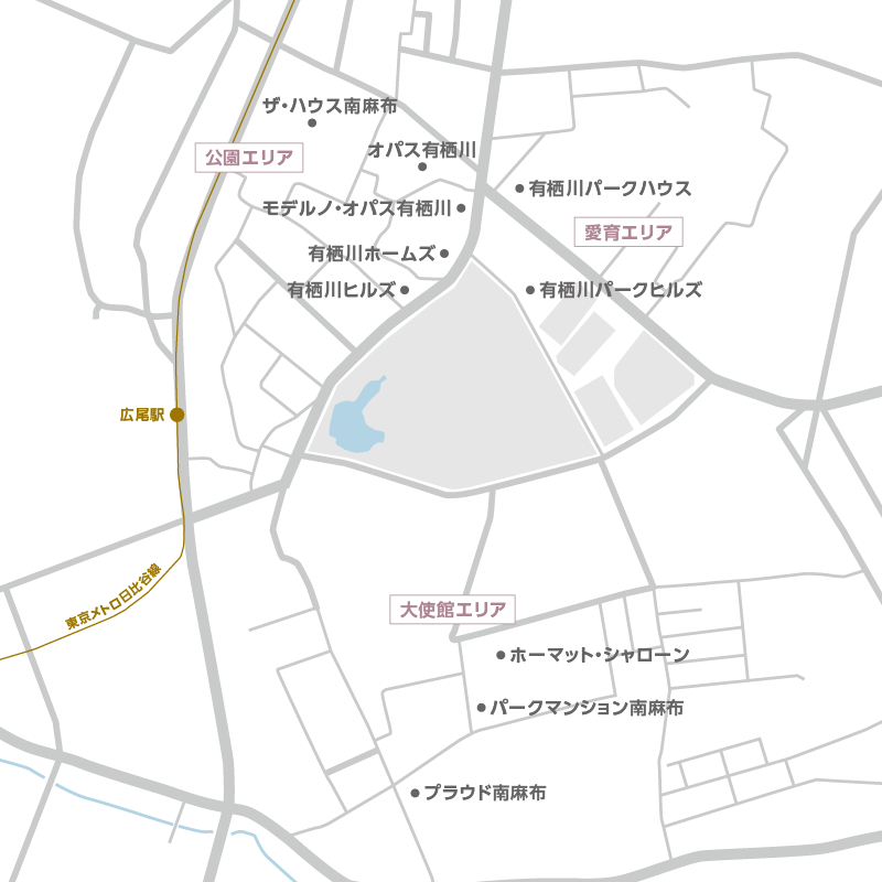 土地に息づく歴史、風雅な緑深き公園、土地形状によって保たれた静謐さ。長い時間のなかで育まれ、受け継がれてきた有栖川の住環境は、数ある東京の邸宅地のなかでも群を抜いている。この地の魅力にふさわしい上質な邸宅マンションも数多く、それぞれに代えがたい魅力を持っている。「東京の名作」としての邸宅マンションをお探しであれば、ぜひこのエリアを検討していただきたい。