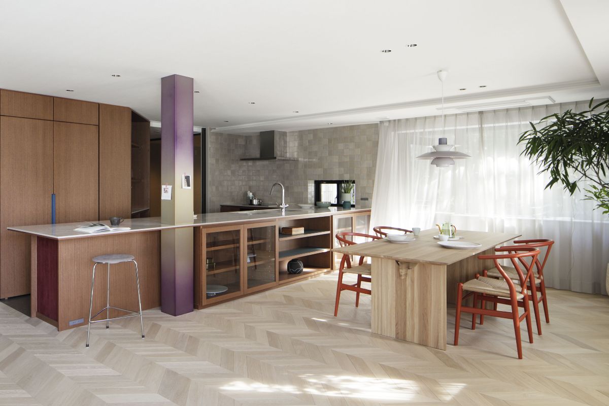 キッチンの象徴であるステンレス製の柱は窓の光を反射し、玄関からリビングダイニングに足を踏み入れたときに高揚感を生む。一日を通じ、さまざまな角度から差し込む光の調子によって色もまたさまざまに変わる。もちろんグラデーションの効果も大きく、立つ位置によっても色の変化が楽しめるのもうれしい。