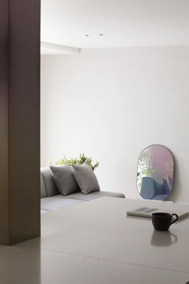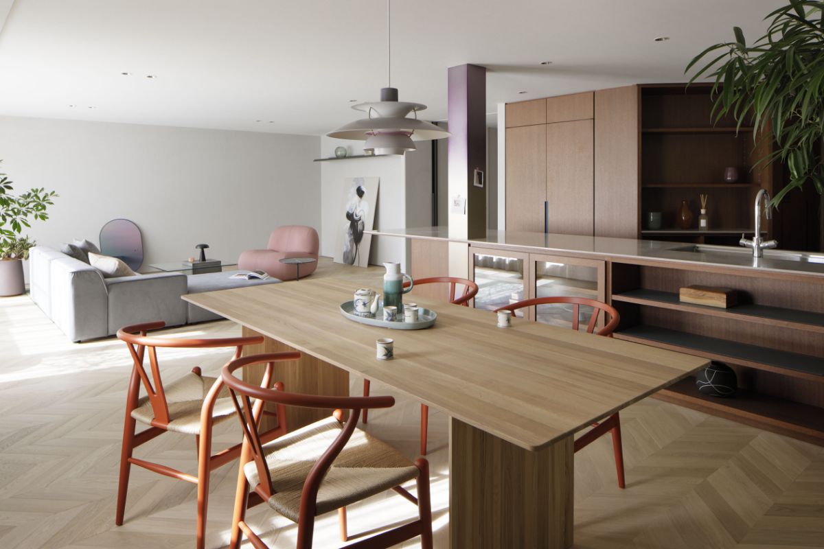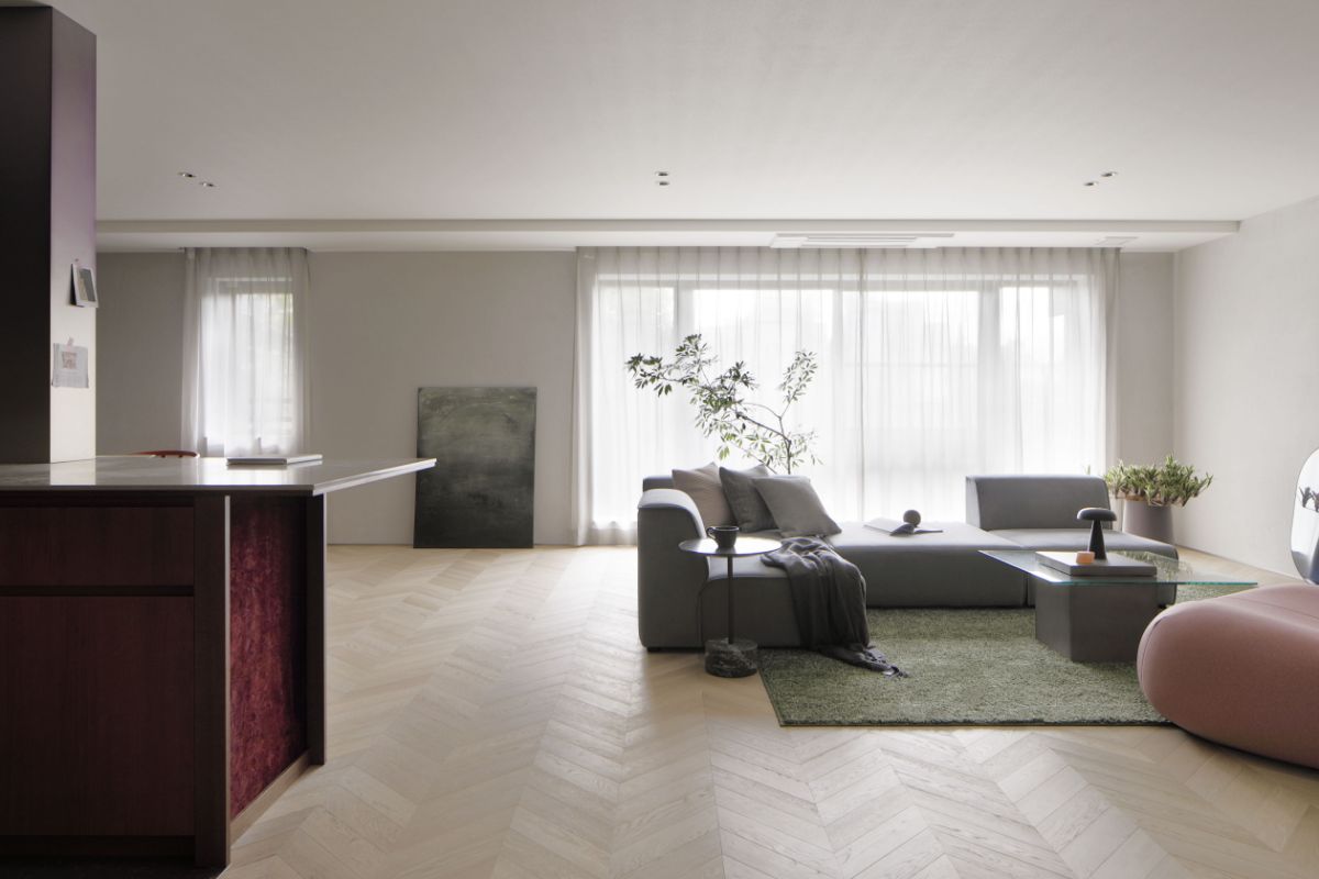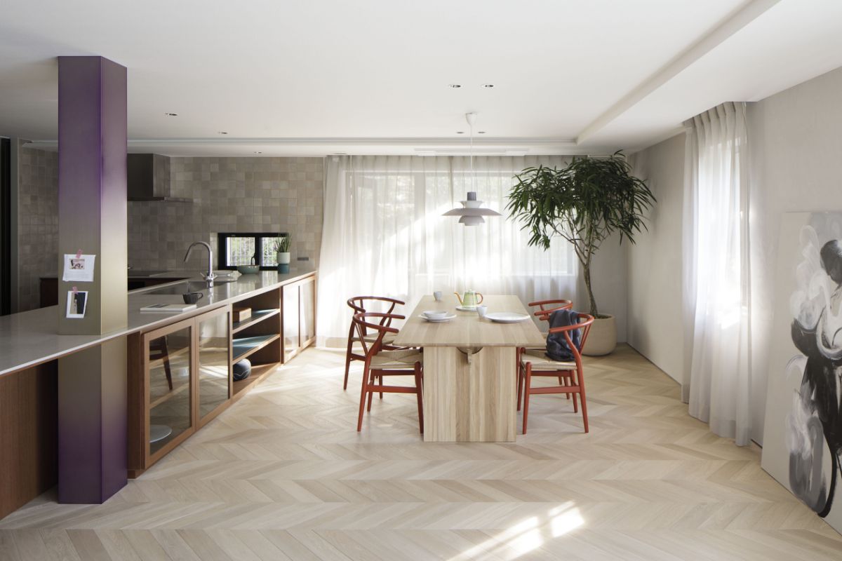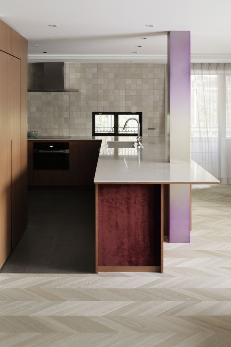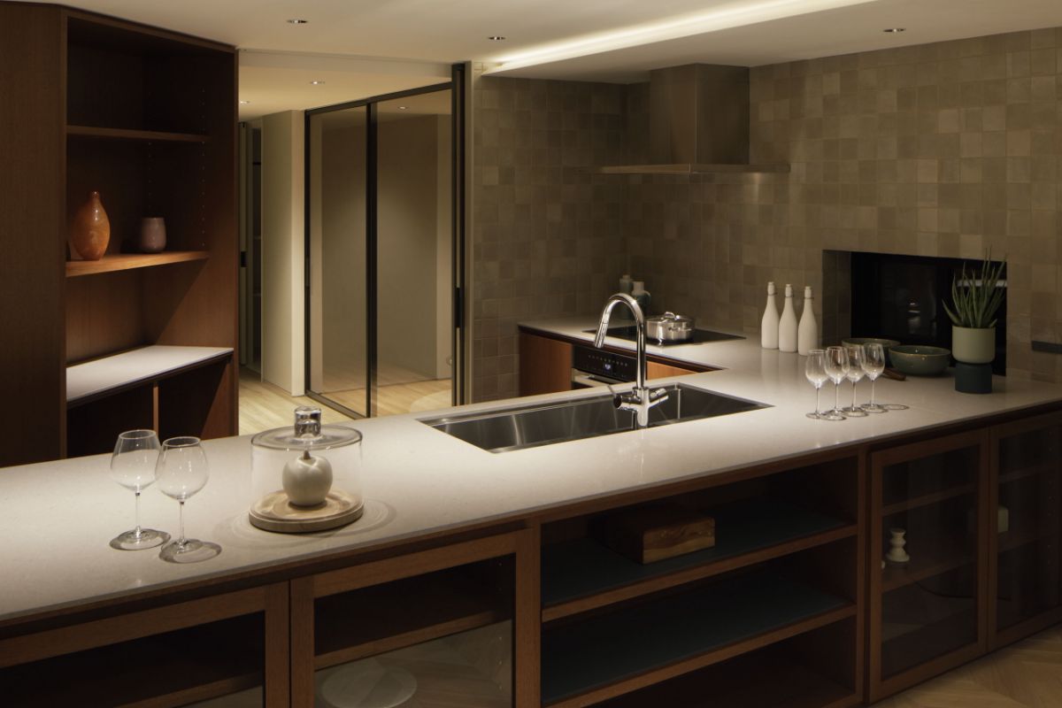 とはいえ、もちろん住まいは日常を楽しむ場所。吉村のアップテンポは思わぬところに潜む。それはたとえば、キッチンカウンターの側面に貼られたベルベットのファブリックだ。この素材を背景に、大ぶりのガラスの花器に花を活けるかもしれないし、オブジェを置く人がいるかもしれないと吉村は語る。今回の設計に先立ってニューヨークのホテルを巡った経験から刺激を受け、こうした素材使いに挑んだ。最先端のホテル、開業から時間を経ても変わらぬ人気を誇るホテル、そして老舗ホテル。そうした空間を巡りながら、時間を超えて愛される要素はなにか。バーガンディのベルベットというと時代がかった素材に見えるかもしれないが、そこには普遍的な美が宿る。