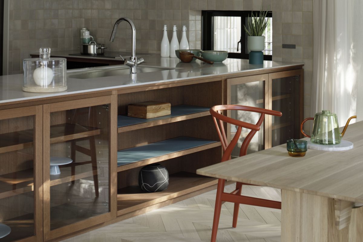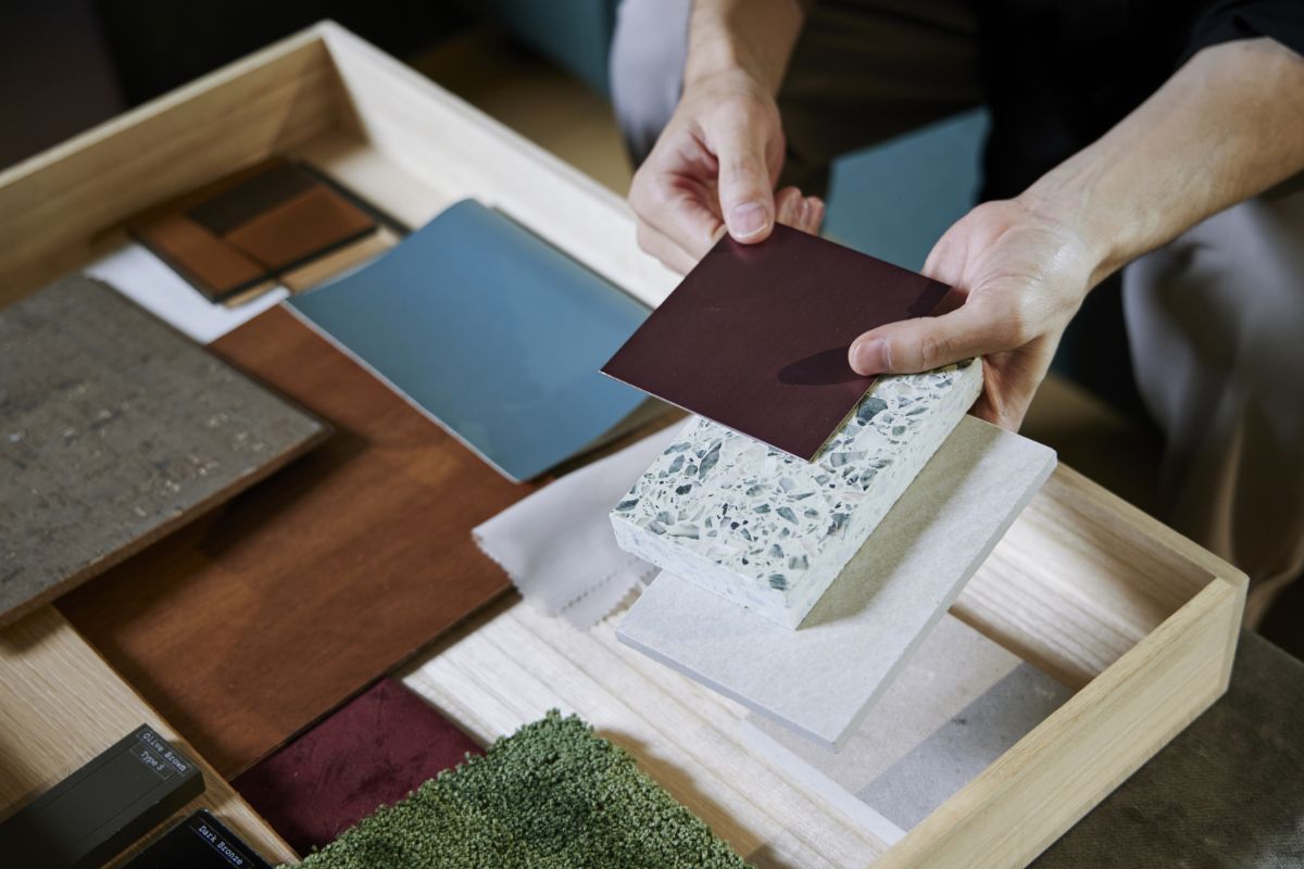 こうした色は木材の赤みを基本に、ベージュ、温かみのあるグレーなどを選定している。家具には深みある赤や緑を入れているが、どれも彩度の低い色を選定した。あくまで空間は背景として、これからここに暮らす人々が色を差し込んでいく。だからこそ細部で思わず飾りたくなる空間を意識した。