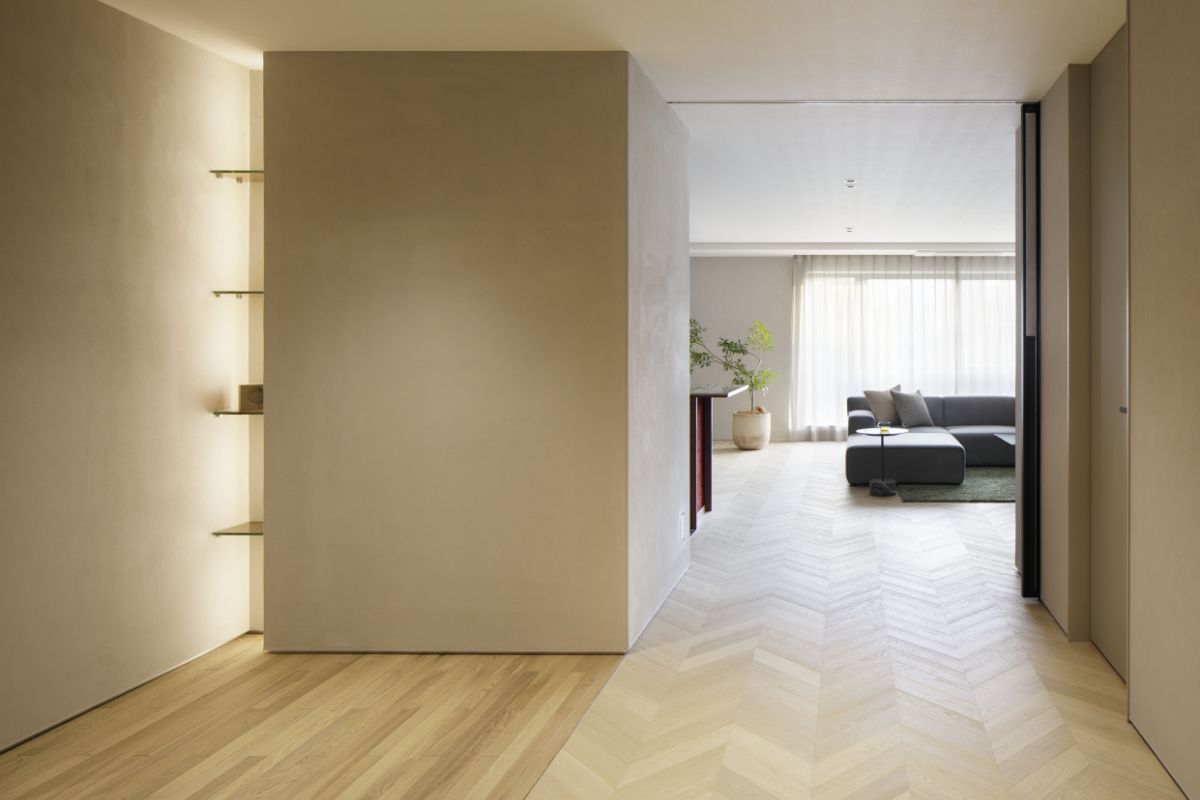 「たとえば共用部から連続する玄関はしっかりとモールディングが取り付けられており、こうしたデザイン言語を踏襲しながら、共用部から室内に宿る世界観との連続性を考えました。壁は漆喰で仕上げているので厚みが出るため、床との調和にモールディングを採用しています」