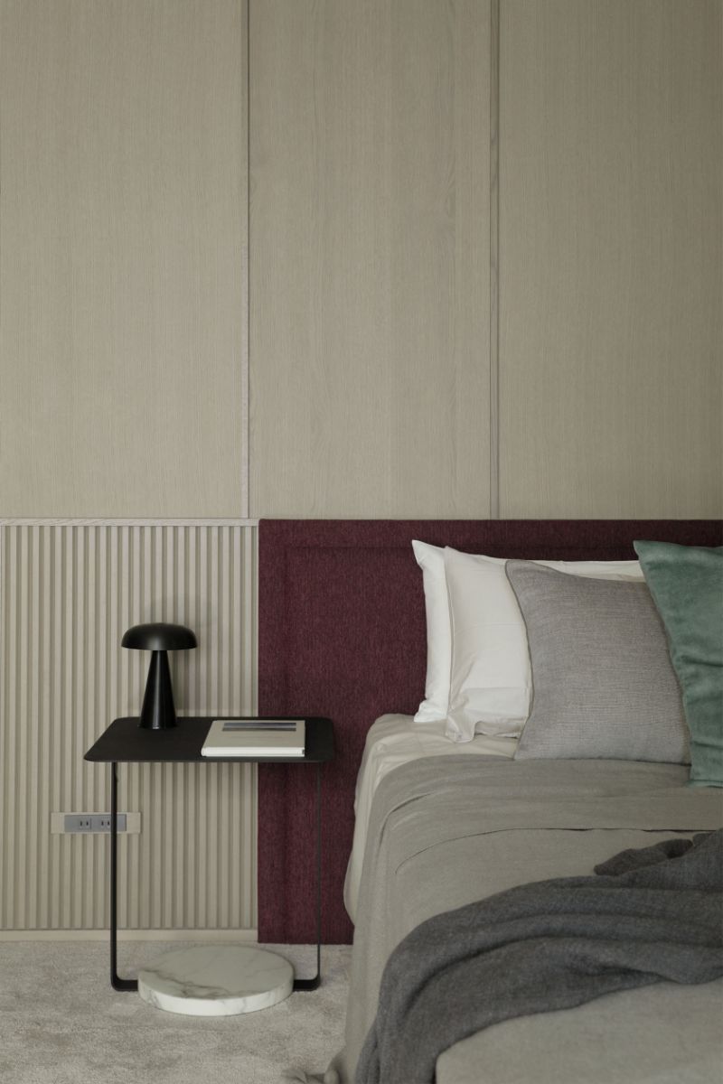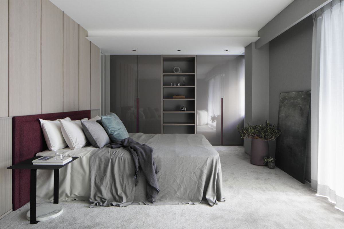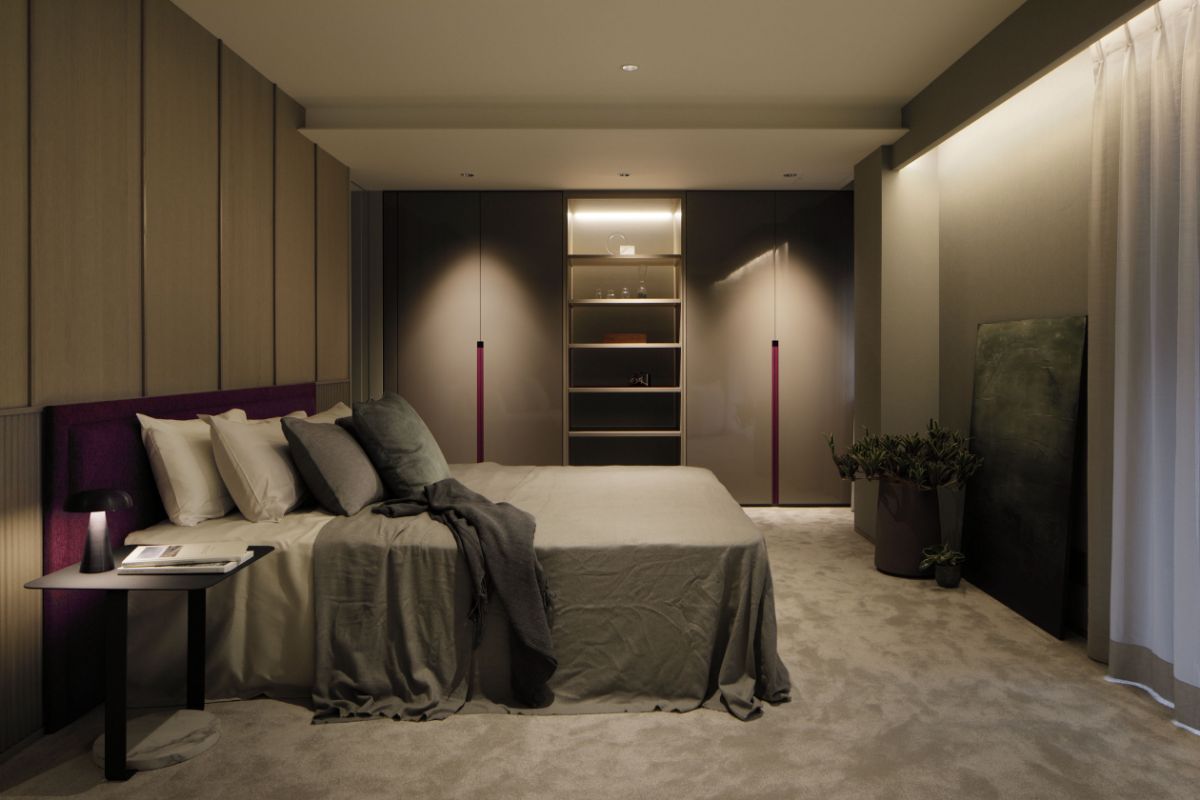マスターベッドルームはホテルライクなプランを採用。ウォークインクローゼットからも浴室にアクセスできるため、就寝時間が違う二人がそれぞれにストレスなく睡眠時間をとることができる。吉村は南に面したリビングやダイニングと、北に面したマスターベッドルームでは光のあり方がそもそも違うことに着目し、そこを整えようと間接照明で光をデザインした。照明の光をカーテンが受けとめ、寝室に入ったときのドラマ性を高める。インテリアを突き詰めて考えるデザイナーという職能もある種の職人だという吉村の考えをよく示すのが、クローゼットの手がかり部分だ。ベッドのヘッドボード同様、手がかりの奥にもワインレッドという色を差し込んだ。